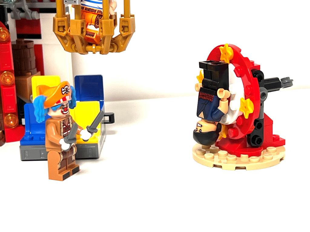 La cage suspendue pour Nami peut s’ouvrir facilement et n’est pas fixée à la structure du chapiteau. La roue de la mort pour Zoro a une molette à l’arrière pour la mettre en rotation. Le réservoir d’eau dans lequel Luffy manque de mourir a une fonctionnalité d’éjection pour une des parois. Il y a aussi les caisses et tonneaux dans lesquels les héros enferment les différents morceaux de Baggy en fin d’affrontement.