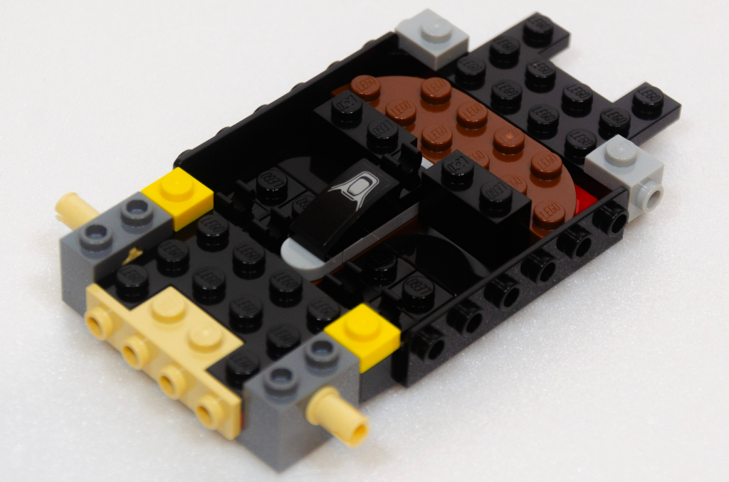 Le peu de couleur disparaît très vite sous de plus grosses pièces noires, Au fur et à mesure de la construction, vers l’étape 35 et les passages de roues faits, j’avais plus l’impression d’avoir fait une batmobile qu’une Mercedes tellement l’allure est trapue. L’intérieur reçoit à nouveau quelques pièces et le tout se consolide très fortement, n’importe quelle phase de jeu ne devrait pas le défaire facilement. Comparé à la SL, le G a moins de sous-ensembles à faire, nous sommes surtout sur de l’empilement de pièces pour définir les lignes droites du design original.
