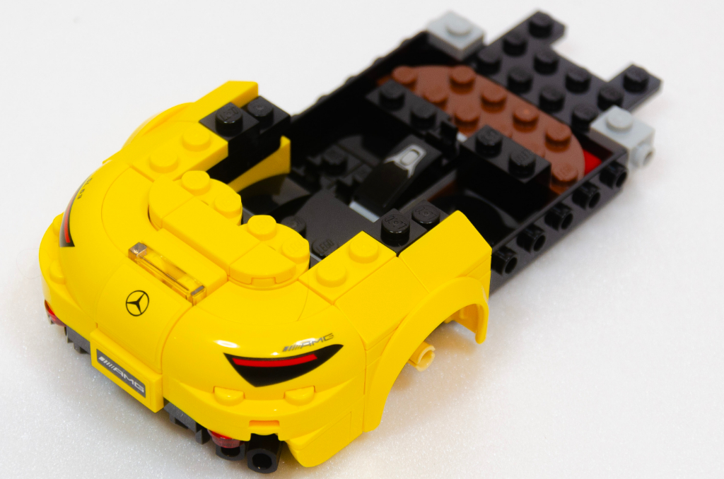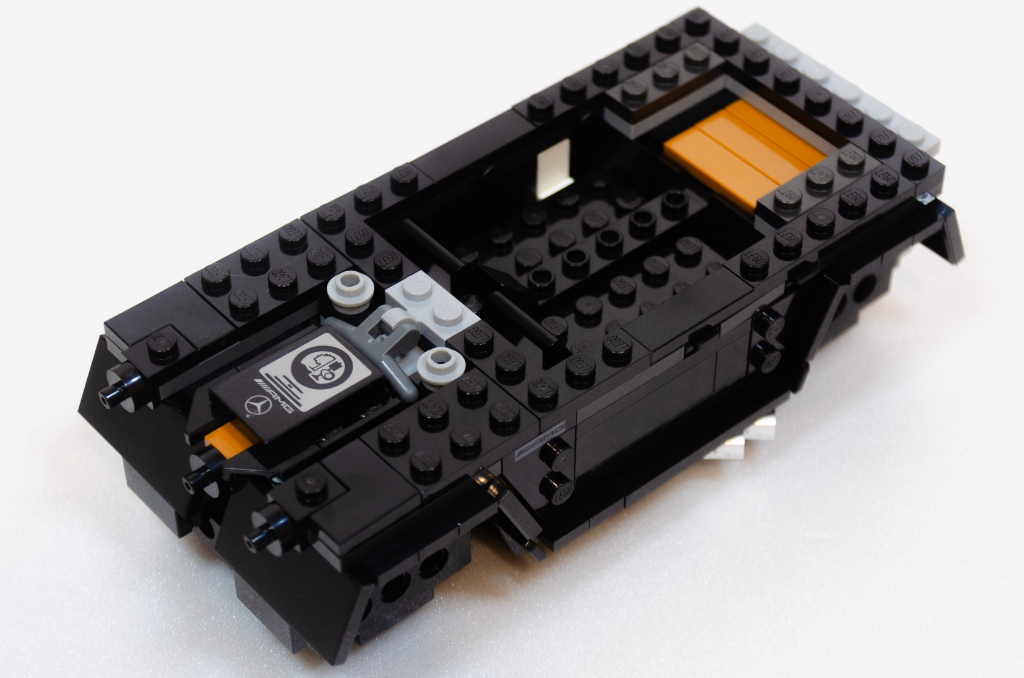 Encore quelques petites pièces pour compléter les différents niveaux, nous attaquons ensuite la calandre (vous verrez d’ailleurs sur les photos que j’ai inversé les pièces symbolisant les prises d’air). Heureusement pour nous, le logo Mercedes est sur une pièce ronde tampographiée, plus facile à centrer et à orienter sur la voiture; les feux sont aussi tampographiés mais LEGO nous gratifie d’un autocollant pour le capot. Capot ouvrant laissant voir le moteur (symbolisé).