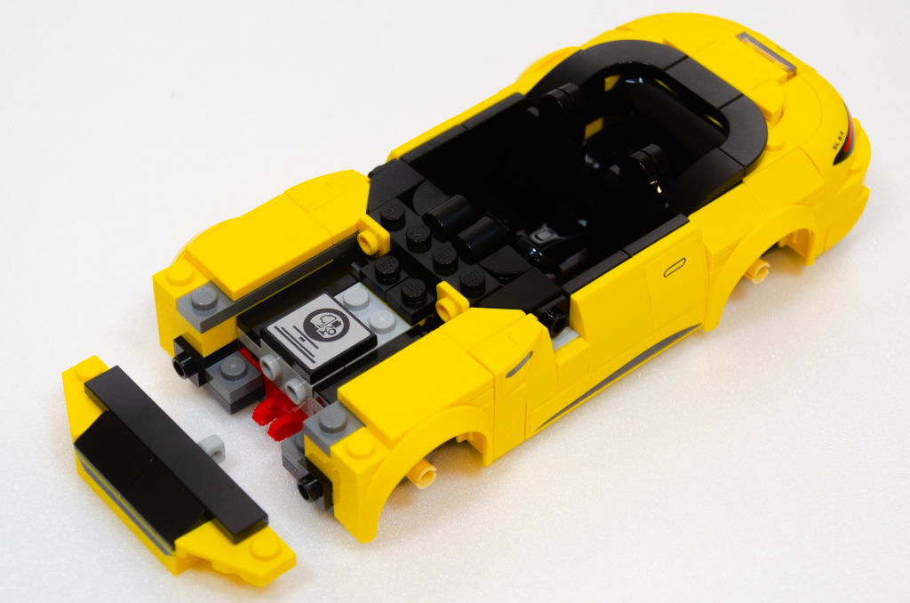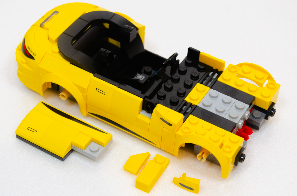 Je vous propose de suivre simplement l’ordre choisi par LEGO en commençant par la belle SL jaune. Comme pour tous les véhicules Speed Champions (et LEGO en général), nous commençons par le châssis avec en toute première étape le passage de roues que nous relions très vite à la métapièce qui sert de base centrale au plancher. Si vous avez déjà lu une de mes guest-reviews précédentes ou mes commentaires sur le blog, je n’aime pas les autocollants et mon petit malheur commence dès l’étape 9 avec un tout petit à placer au niveau central et comme échauffement, j’avais espéré mieux.