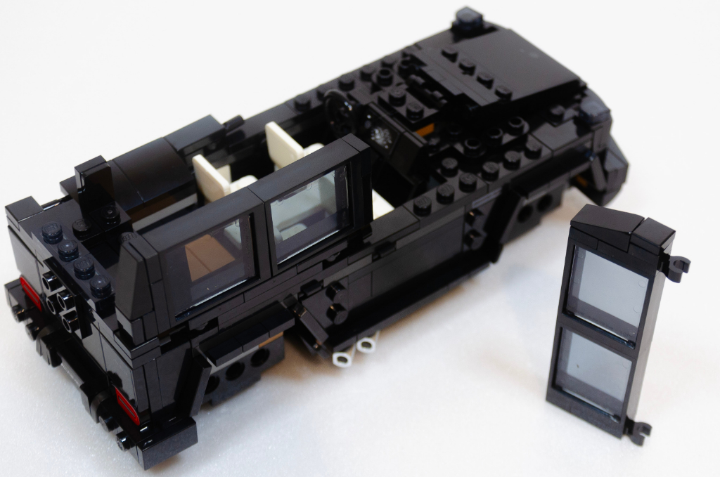 Passons au monstre, l’énorme classe G AMG et là, fini la couleur, c’est noir avec du noir et surtout du noir (j’ai d’ailleurs dû éclaircir un peu les photos pour illustrer l’article). Ici surprise, pas de metapièce mais une tige Technic et un plancher construit sur cette base.