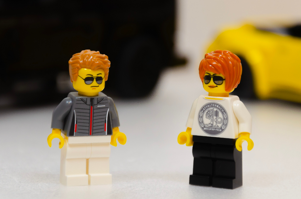LEGO a joué la simplicité avec les minifigs fournies, à savoir deux conducteurs en respectant la parité. Pas de double visage (alors que les cheveux recouvrent bien la nuque) et des jambes unies pour tout le monde. Pour le chauffeur de la SL, il porte une doudoune grise AMG et arbore des lunettes de soleil. La propriétaire du classe G est aussi équipée de solaire mais porte un très joli haut au logo finement détaillé.