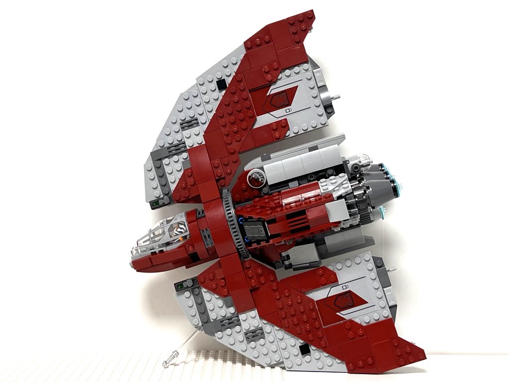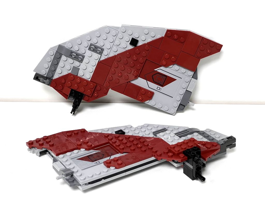 Soyons clair et honnête d’entrée, ce vaisseau n’est pas un UCS et ne peut donc pas rivaliser en terme de finitions avec ce qu’un bon millier de pièces en plus aurait pu donner comme rendu. Donc, si on le regarde le côté décoré des ailes ça fait le job. Par contre, l’envers est complètement dépourvu d’éléments, c’est brut de revers de plates.