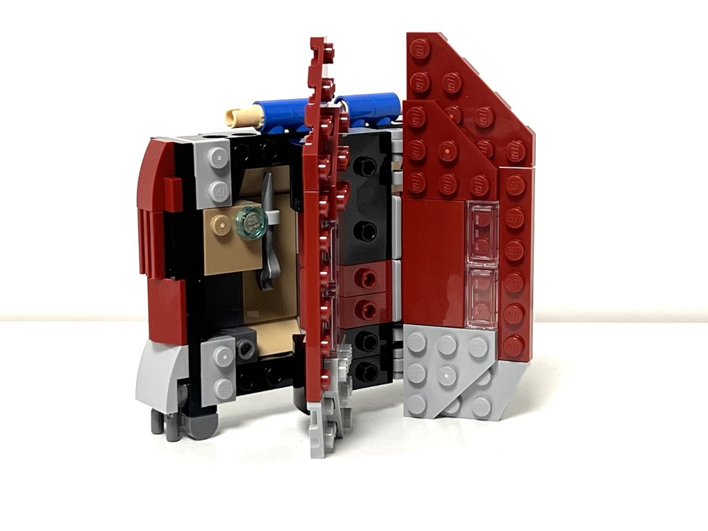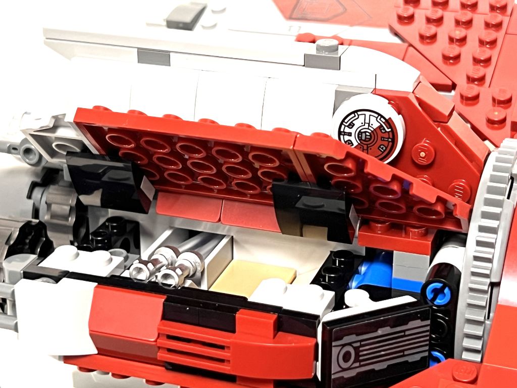 Pour le reste, c’est correct avec quelques défauts, notamment le poste de pilotage qui dépasse un peu trop de la courbure des ailes, le vaisseau qui ne peut embarquer qu’une seule minifig, la roue crantée visible. Mais on a des trains d’atterrissage, certes sommaires, qui s’insèrent parfaitement dans la carlingue et deux compartiments de rangement de part et d’autre du fuselage supérieur. Et l’ensemble est très solide. Mention spéciale pour la représentation de la station de tir à l’arrière au-dessus des réacteurs. 😉