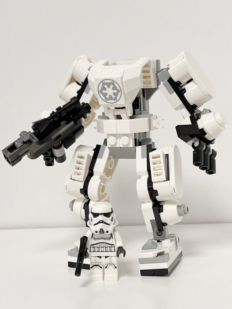 D’un point de vue design, on reconnait instantanément à quel personnage fait référence le Mech. Le choix des articulations coudes & genoux fixes peut paraitre limitant mais aux mains d’un jeune enfant (les sets sont des 6+) ça a le mérite de résister aux séances de jeu auxquelles ces boites sont destinées. Je regrette le dos du Stormtrooper nu, on aurait pu y voir un léger bosselage comme celui de Vador. J’apprécie par contre que le designer ait prévu suffisamment de place pour chaque minifig avec son accessoire, notamment Boba et son jetpack.