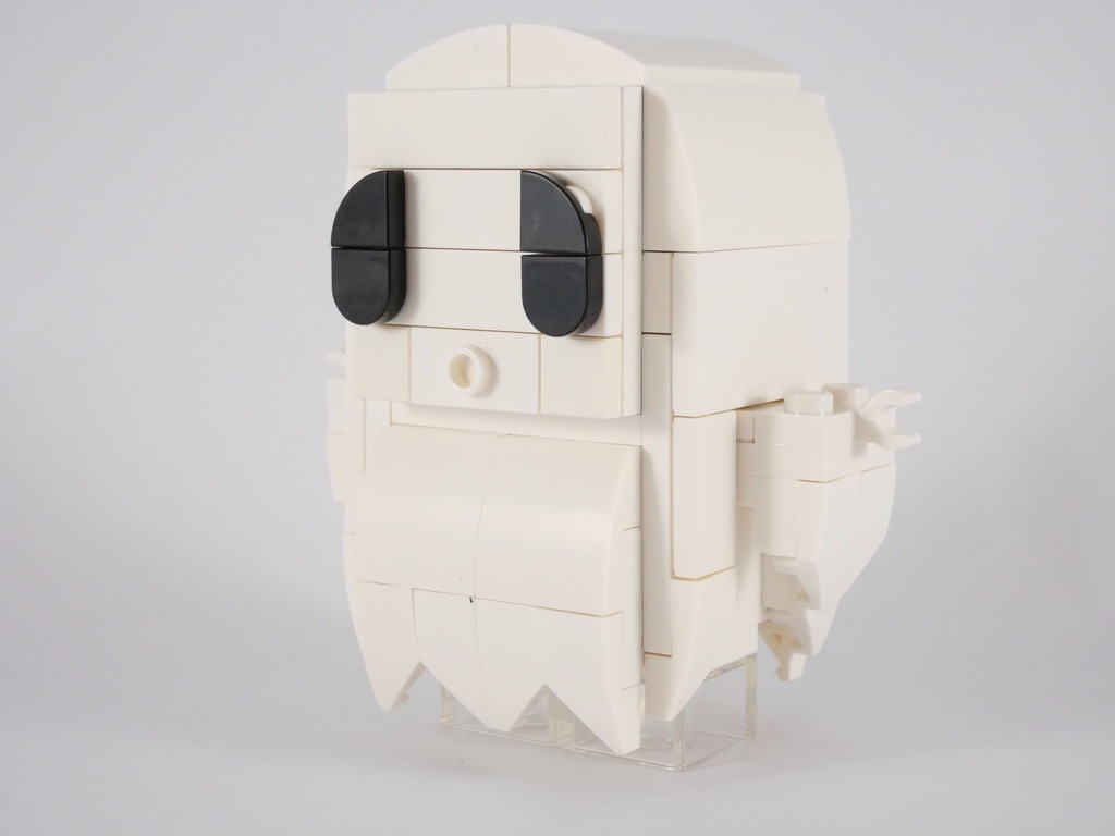 Le design est simple, mais ça se comprend aisément dans le cas d’un fantôme. La forme est sympa, la courbure du haut du crâne se prolongeant sur les flancs. On a vraiment l’impression d’un drap posé sur un fantôme. Je suis moins convaincu par la forme du « ventre », et par symétrie de celle du dos. J’aurais préféré que ce soit aligné avec la face, quitte à faire un peu plat. Au dos, derrière la tête, il aurait été intéressant de retrouver un bombé qui se serait prolongé en partie basse.