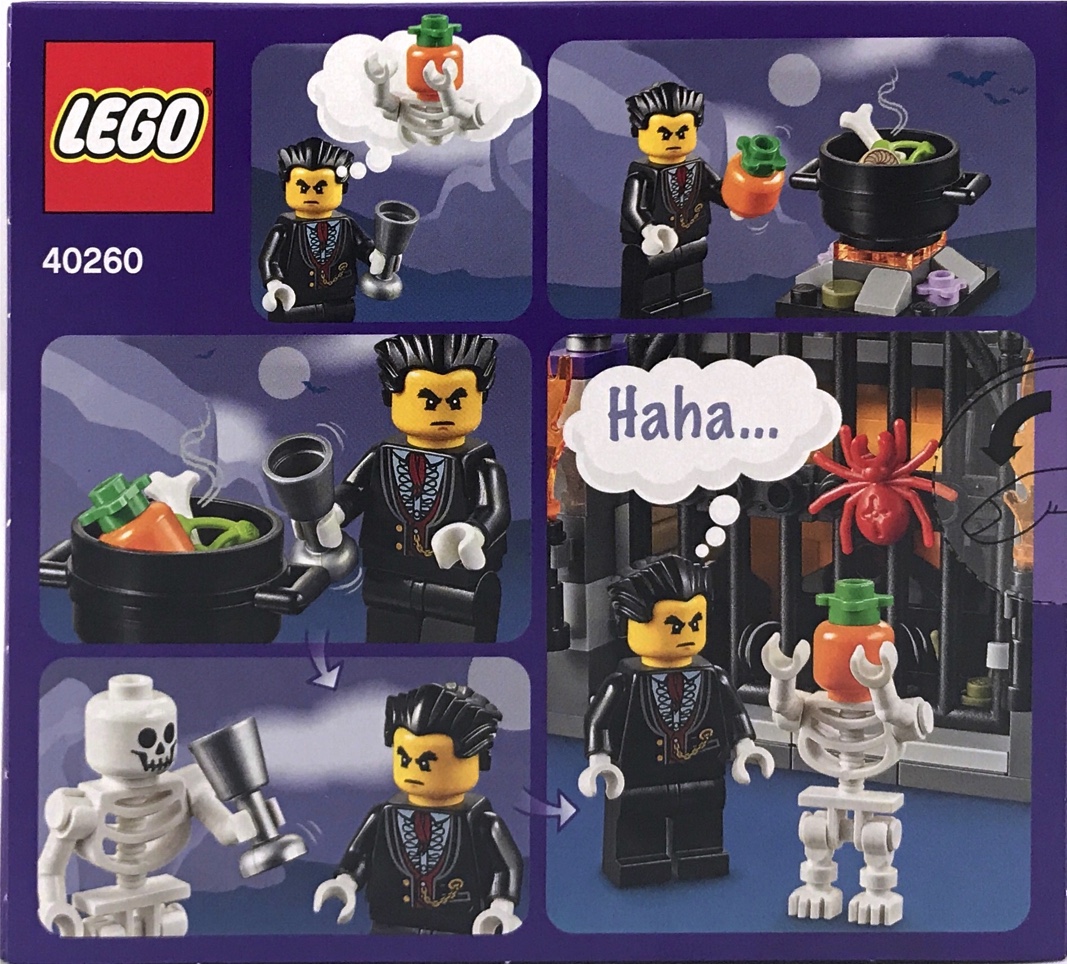 Notre set est présenté sur un fond mauve, où l’on devine quelques montagnes, ainsi que des chauves-souris et la pleine lune pour se mettre dans l’ambiance. Une grosse tête de mort dans le coin supérieur droit nous le rappelle encore, sait-on jamais. Les deux minifigs posent aux côtés du chaudron, devant le portail grand ouvert. Un rat traîne dans le coin. Sur l’arrière, ce qu’on pourrait qualifier d’une mini bande dessinée, que je vous laisse découvrir sur la photo.