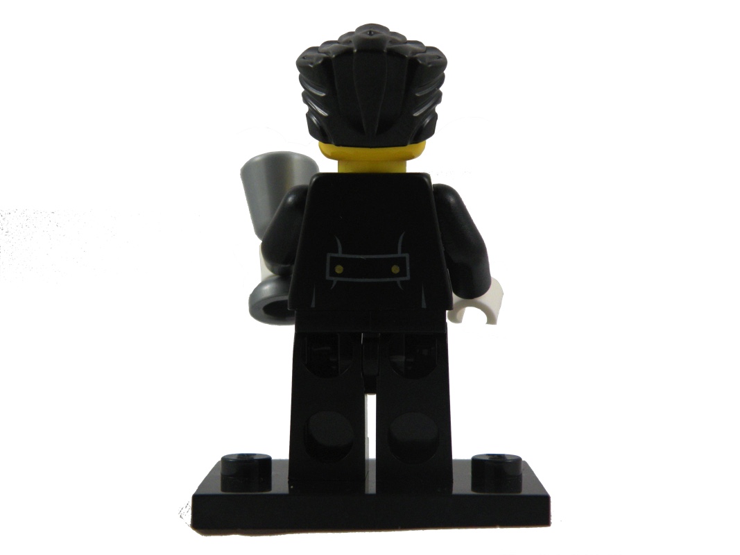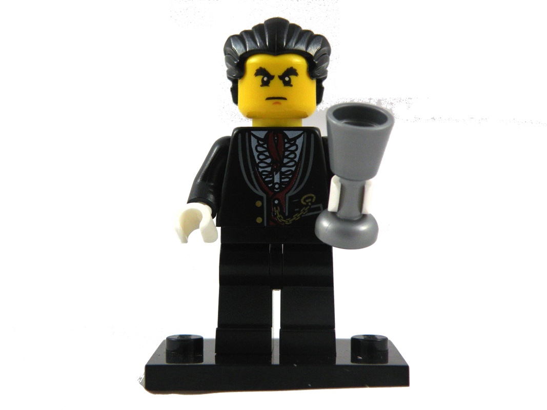 Il porte un costume noir, avec une chemise grise, et une chaîne pour la montre à gousset qui va jusque dans la poche. Les jambes sont moins travaillées, puisque monochromes (et noires, normal). Il fronce les sourcils sous ses cheveux noirs, et porte en guise d’accessoire une coupe argentée. C’est soigné, sans être exceptionnel, et l’expression du visage est vraiment sympathique.