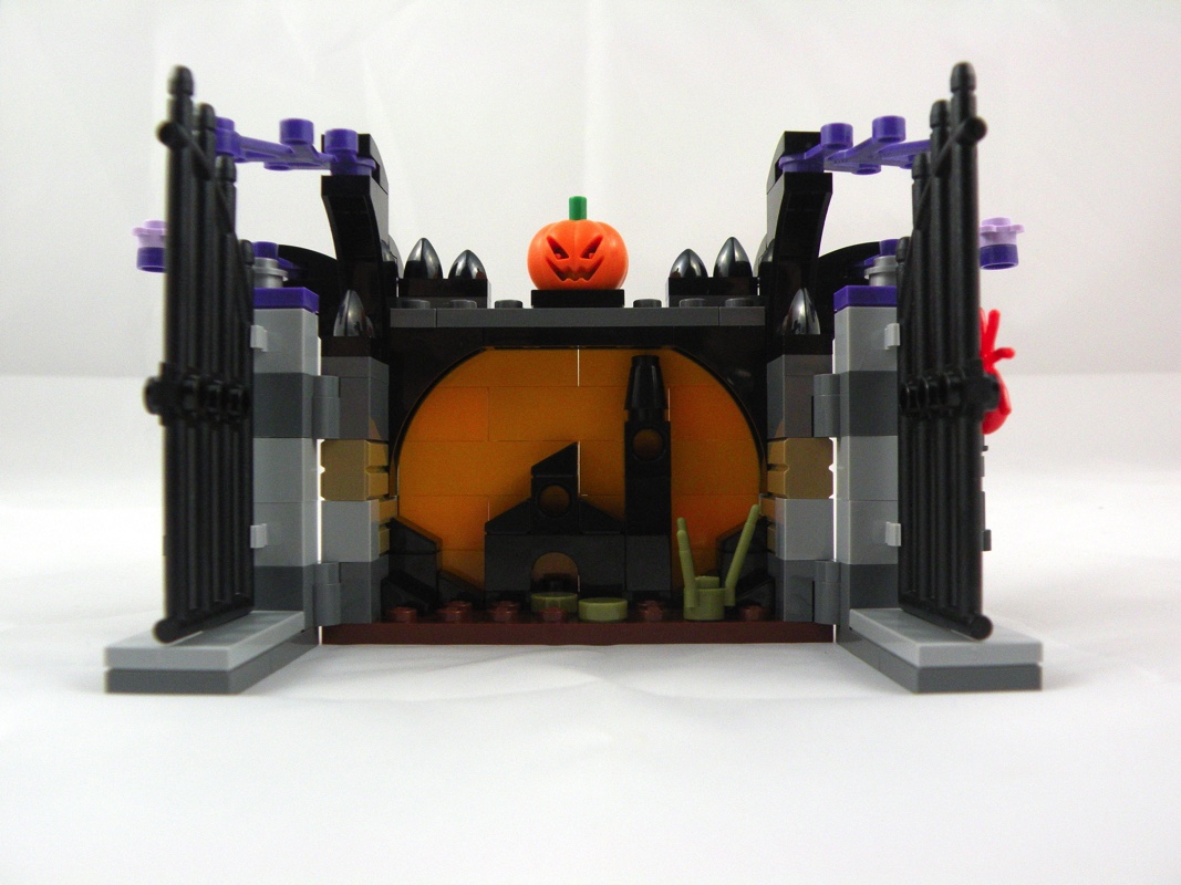 Enfin, la partie la plus intéressante, le portail avec son château en arrière plan. On assemble, afin de donner cette perspective, un coucher de soleil en arrière-plan à base d’arches noires assemblées devant un fond en bright light orange, sur lequel se découpe le château réalisé grâce à un assemblage ingénieux de pièces noires, et notamment des petites briques Technic 1×1 et une arche qui laissent passer la « lumière » du soleil. Pour une réalisation à cette échelle, c’est vraiment réussi. On assemble la grille sur des charnières, et on l’habille de torches et d’une araignée qui apparaissent seulement en position fermée. Sur la partie supérieure, la citrouille obligatoire trône aux côtés de feuilles en dark purple surmontées de fleurs plus claires.