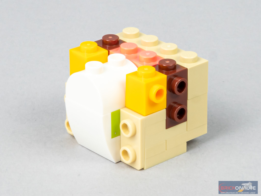 Le début de la construction m’a fait penser à celle du set 40379 Valentine’s Bear. Les deux pattes arrières du hamster adulte et son ventre sont fixées sur des brackets de la même manière. Une pièce arrondie surmontée d’une arche constitue la partie supérieure du torse. Au-dessus, c’est plus conventionnel : on retrouve la structure de la tête composée de briques SNOT, qu’on habille sur ses différentes faces. On remarquera évidemment le volume inhabituel de la tête pour former les bajoues de l’animal, réalisées avec des pièces courbes. La forme des oreilles est également bien trouvée.