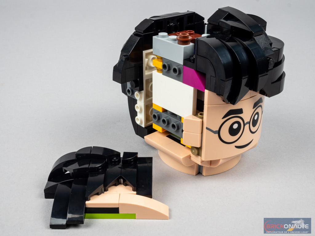 Vous le voyez sur la photo précédente, il ne manque plus que la tête de ce pauvre Harry. On commence par en assembler la structure, comme on pourrait la retrouver dans les casques / têtes déjà sortis dans les gammes Star Wars ou Marvel : des plates, quelques cadres et beaucoup d’éléments SNOT. Le cou est représenté par une rangée de slopes, et le raccord avec le visage avec une seconde rangée. C’est d’ailleurs, à mon goût, le défaut principal de ce set : ce raccord est un peu approximatif.