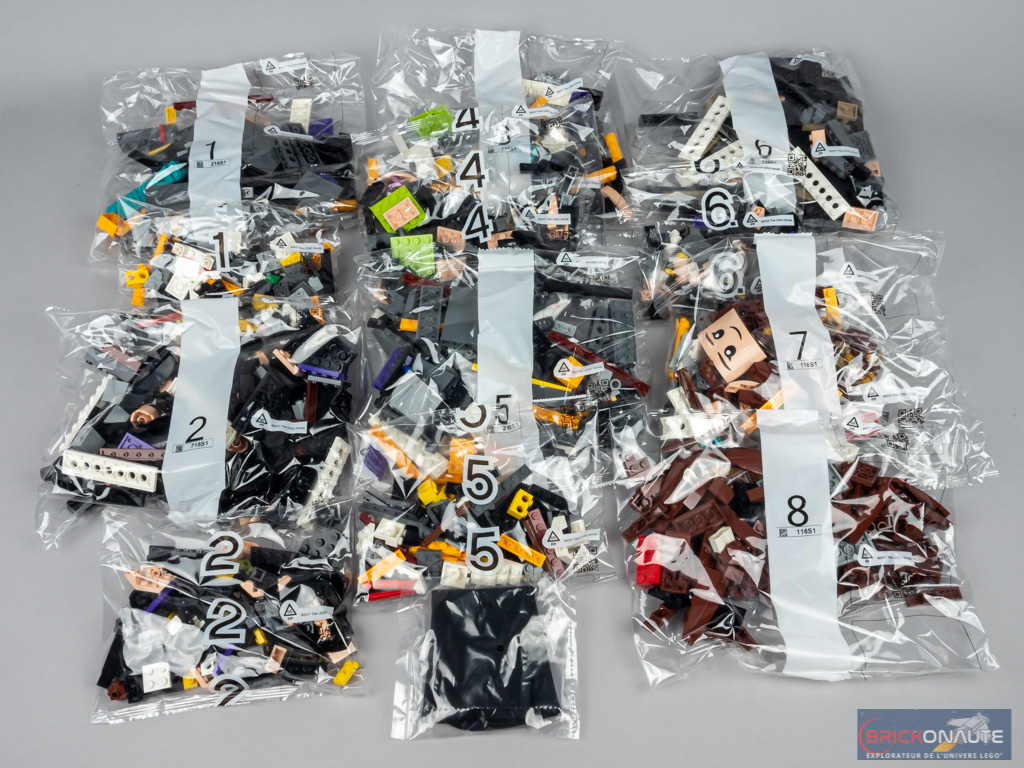 À l’intérieur, nous trouvons 12 sachets de pièces numérotés de 1 à 8, un 13ème contenant la cape de Harry. Nous avons également deux notices d’instructions séparées (140 et 148 pages), une par personnage.