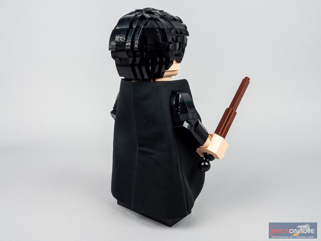 Remarquez ici la pièce utilisée pour le visage, tampographiée. Il s’agit d’un tout nouvel élément au doux nom de BRICK 4X6, OUTSIDE BOW W/ CUT OUT. Comme on le ferait pour d’autres sets, on habille ensuite la structure du visage sur ses différentes faces avec ici une chevelure particulièrement travaillée. Il faudra d’ailleurs être vigilant lors de la lecture des instructions. On appréciera également la slope tampographiée de la cicatrice en forme d’éclair. Une fois la tête terminée, il ne reste qu’à la fixer au corps et notre premier personnage est terminé.