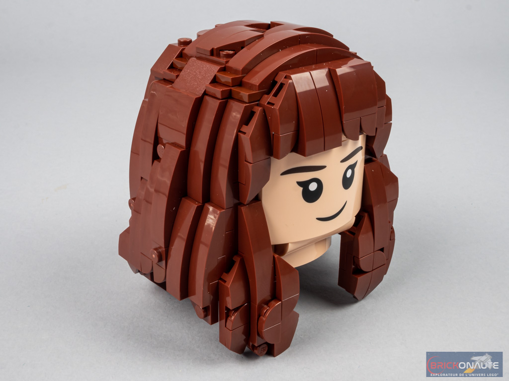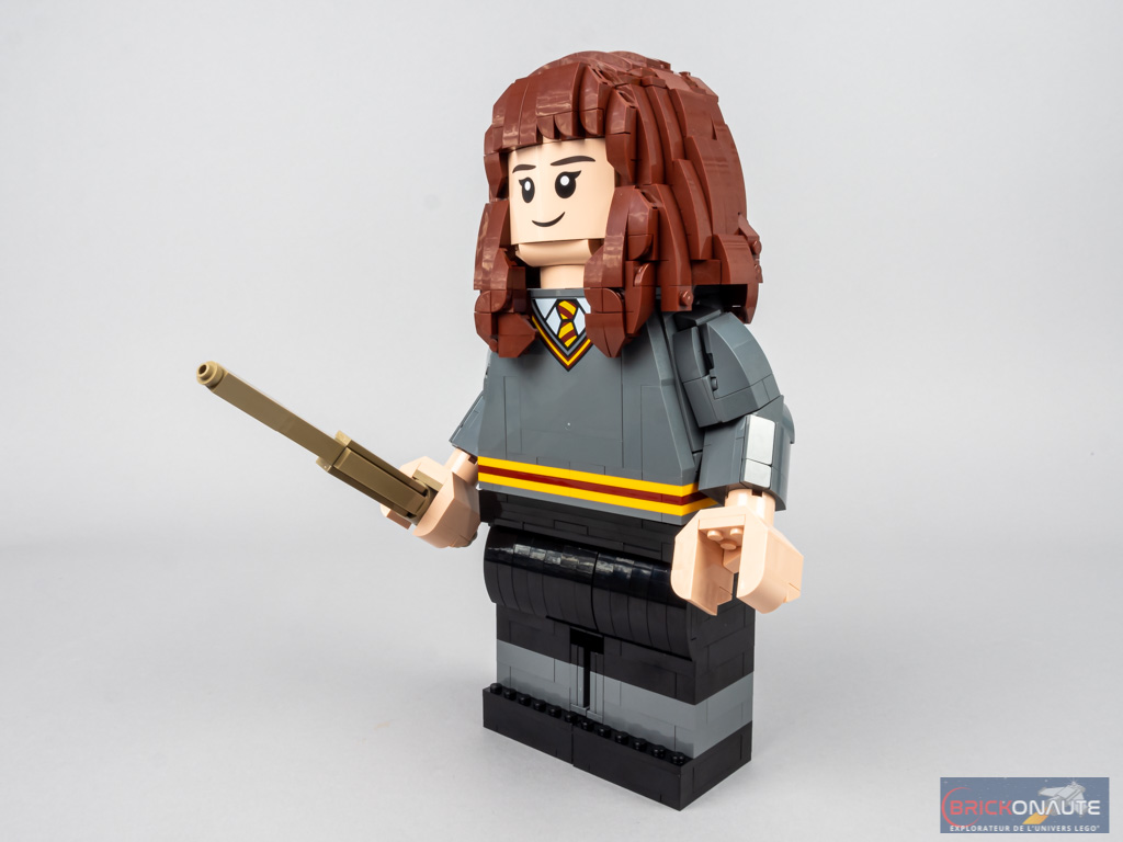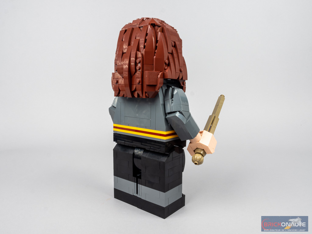 La conception de nos maxifigs, qui pourrait paraître simple au premier abord, est finalement plus complexe qu’elle n’y parait. Elles sont assemblées de la même manière que pourrait l’être une « vraie » minifig, dont on retrouve tous les composants : torse, bras, mains, tête, hanches et jambes. La seule différence résidant dans le fait qu’on ne peut pas retirer la chevelure – bien fixée sur la structure de la tête. On remarquera également le petit « easter egg » du designer : chacune des baguettes magiques renferme une petite barre colorée symbolisant le « coeur » de cette dernière : une plume de phénix pour Harry Potter, et un ventricule de dragon pour Hermione Granger.