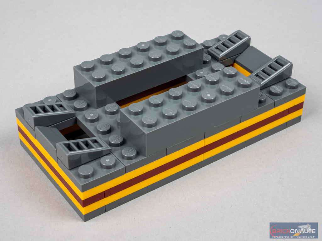 On commence par assembler un cadre qui sert de « base » au torse. Un liseré dark red / flame yellowish orange nous rappelle les couleurs de la maison Gryffondor. La partie « centrale » du torse est composée de 4 éléments : 2 bases constituées d’éléments technic, dans lesquelles viennent se fixer deux sous-ensembles constituant les côtés du torse / les épaules. À l’intérieur, un ingénieux système à base d’engrenages et de pins à friction permettra par la suite de positionner les bras sans qu’ils retombent sous leur propre poids. On avait déjà pu voir un tel système (encore plus robuste) dans un tout autre set, pour les pattes du T. rex de la référence 75936 Jurassic Park: T. rex Rampage.