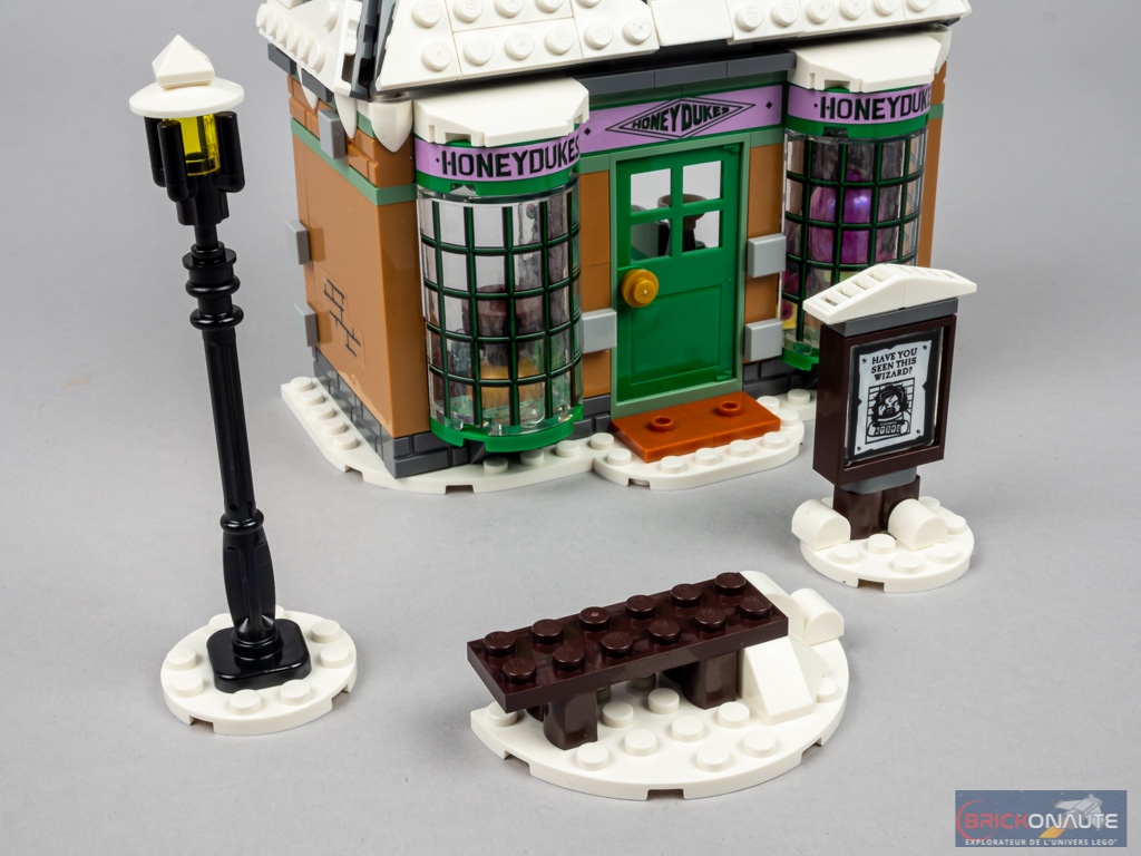 On notera tout de même qu’afin de proposer une boîte à un tarif raisonnable, leurs dimensions ont été adaptées : la confiserie Honeydukes aurait dû être plus large, et l’auberge Les Trois Balais plus haute. 3 « accessoires » sont malgré tout inclus : un banc, un candélabre et un écriteau portant l’avis de recherche de Sirius Black.