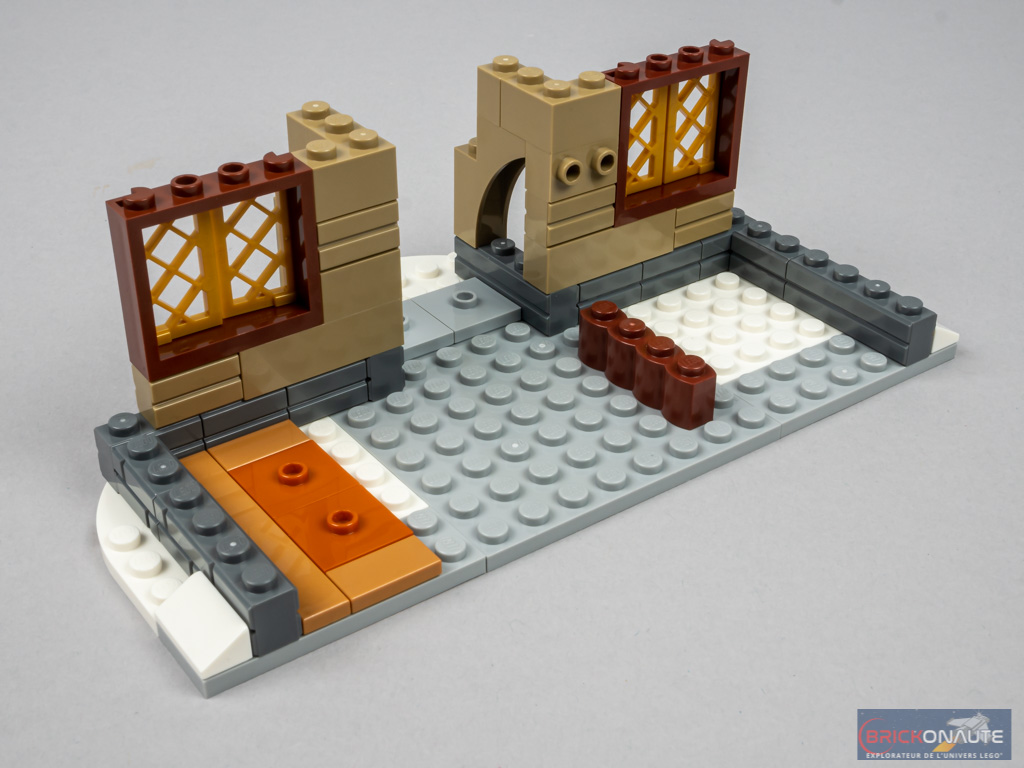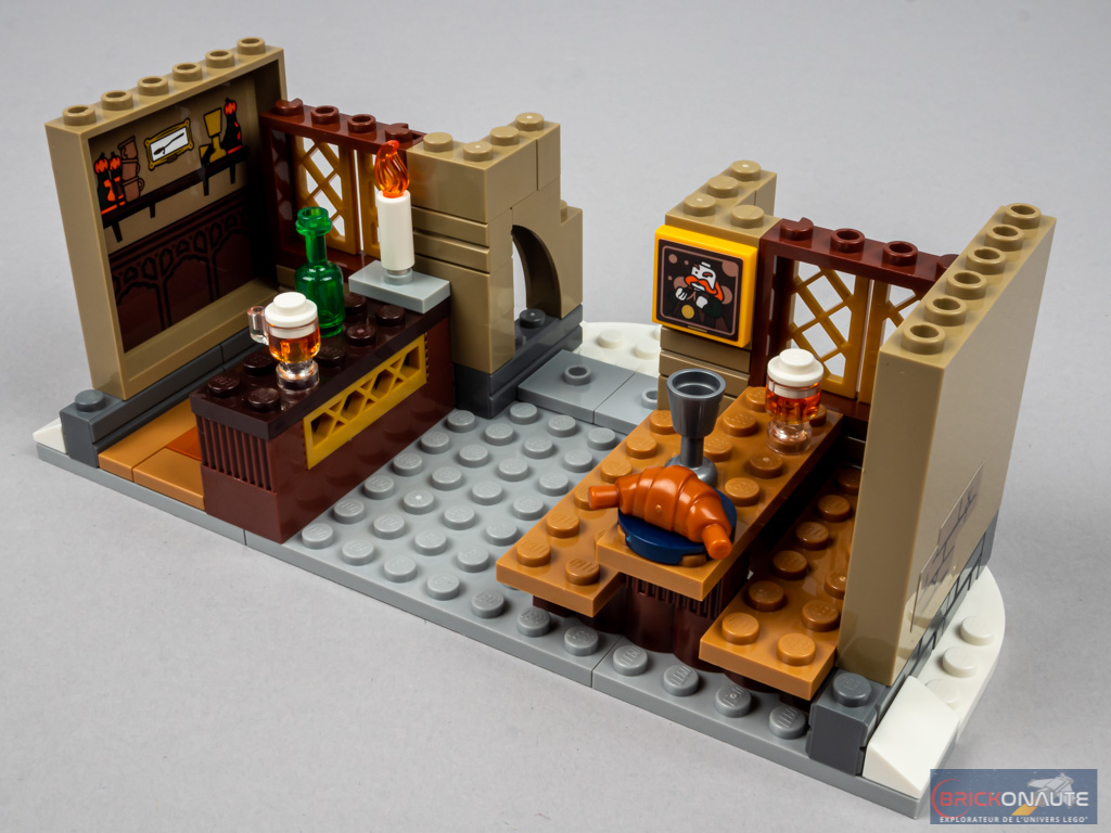Nous passons ensuite à l’assemblage du second bâtiment, l’auberge Les Trois Balais. Que l’on entame logiquement par la base, ici de couleur grise et blanche. La première rangée de brique est gris, les suivantes seront en dark tan. On construit ainsi la façade avec deux fenêtres, avant de nous occuper de l’intérieur. On y trouve un comptoir et une grande table, ainsi que quelques accessoires : une bougie, une coupe, une bouteille… et évidemment deux bières au beurre. Sur chacun des deux côtés, on fixe un grand panel lui aussi décoré d’un autocollant côté intérieur. Décidément…