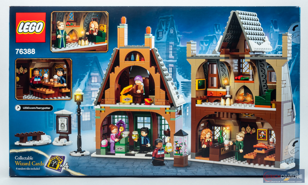 Sur la face avant de la boîte, les tenanciers des deux établissements sont devant leurs portes : M. et Mme Flume pour la confiserie Honeydukes, et Mme Rosmerta pour l’auberge Les Trois Balais. Deux élèves sont de sortie (Harry Potter et Dean Thomas), ainsi que Minerva McGonagall. Sur le côté, on apprend que le set contient une minifig dorée exclusive à l’occasion des 20 ans de la gamme. Il s’agit ici de Ron Weasley. Au dos, on découvre l’intérieur des deux bâtiments ainsi que quelques mises en scène. Il y est également précisé qu’on trouvera dans la boîte 4 Wizard Cards aléatoires à collectionner.