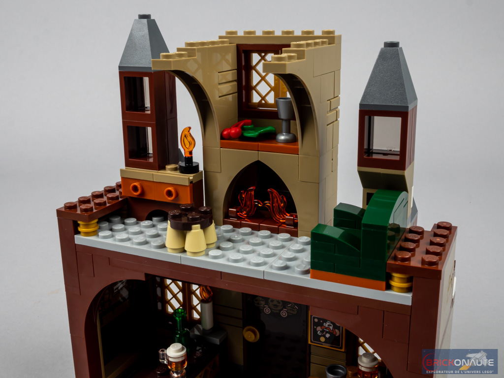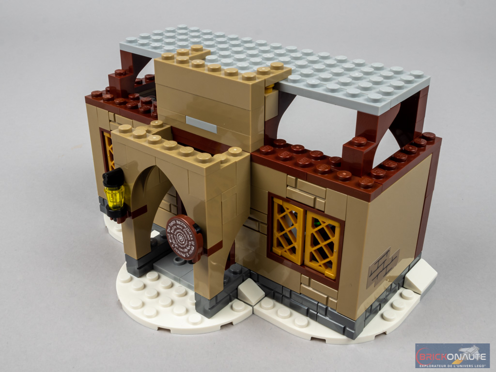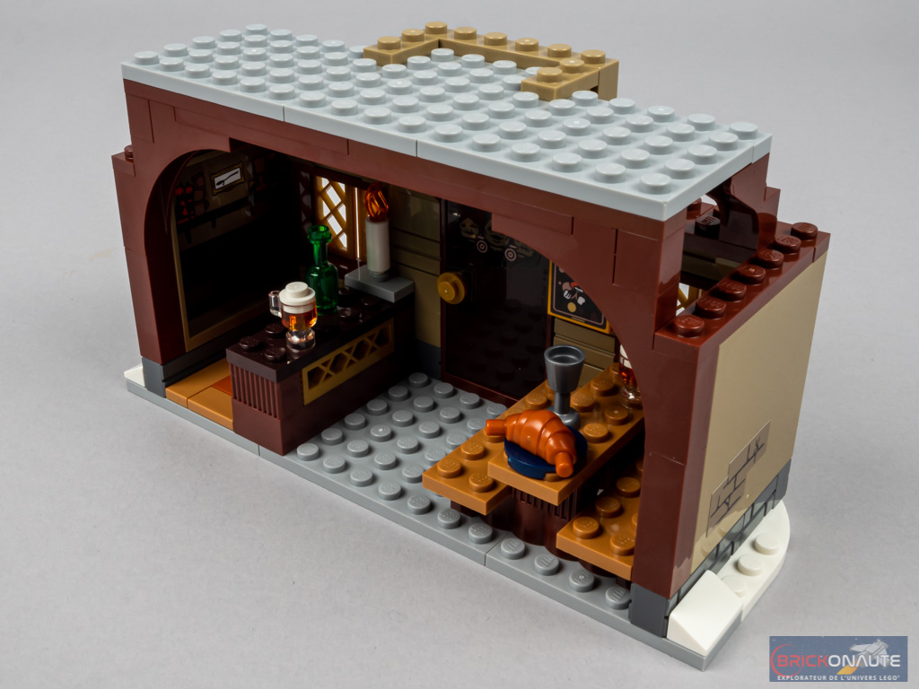 Ça, c’est dit. Car pour le reste, c’est franchement pas mal. À commencer par le design extérieur des deux bâtiments. Les formes et les couleurs sont cohérentes avec leurs alter-egos cinématographiques, même si un sand green aurait peut-être été plus adapté pour la confiserie. Le côté asymétrique de la taverne est bien reproduit, et l’échelle entre les différents niveaux des bâtiments est cohérente – tout comme l’angle retenu pour les toitures. La neige est joliment représentées sur celles-ci, plaçant comme il se doit notre (portion de) village en saison hivernale.
