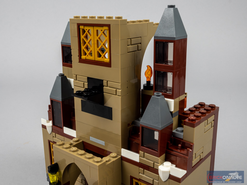 Sur la porte, un autocollant reprend les têtes rétrécies vues dans le film / le livre. On ajoute des arches et plates couleur reddish brown qui supporteront l’étage supérieur, avant de construire un petit porche devant l’entrée décoré comme il se doit. On termine cette étape avec le plancher du premier étage.