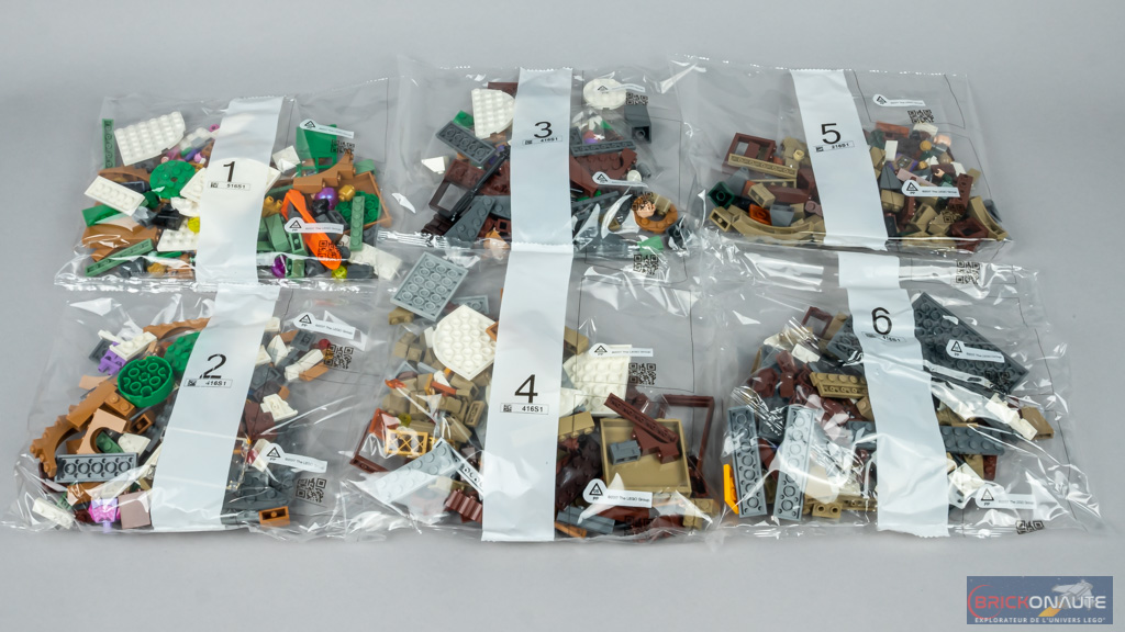 À l’intérieur, nous trouvons 6 sachets de pièces numérotés – 3 pour chaque bâtiment. Nous avons également deux notices d’instructions (92 et 116 pages), et 2 planches d’autocollants. L’une est sur un fond transparent et servira pour Honeydukes, l’autre est opaque. Les notices et les planches de stickers sont livrées en vrac dans la boîte, les miennes sont arrivées un peu cornées. Si vous constatez des dégradations plus importantes, n’hésitez pas à le faire savoir au service client LEGO qui fera le nécessaire.