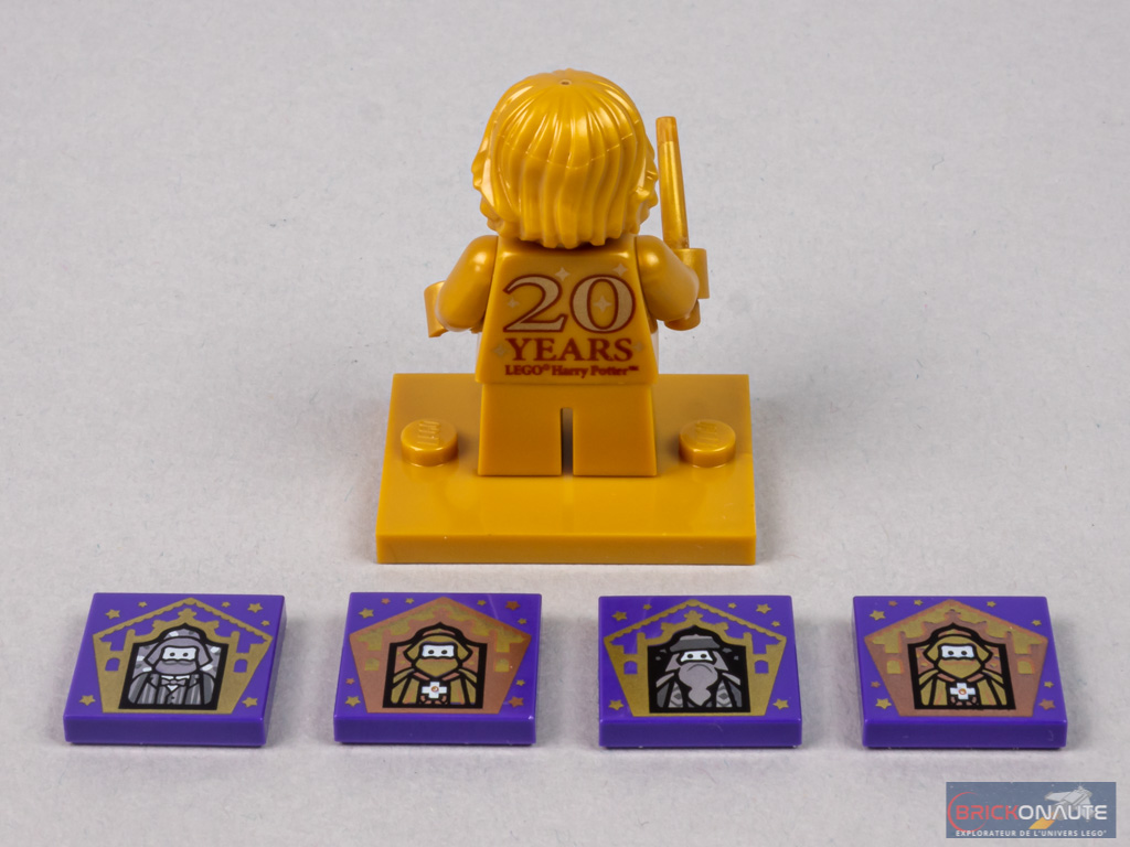 Plusieurs sets LEGO Harry Potter sortis cette année sont accompagnés d’éléments « collector » visant à célébrer le 20ème anniversaire de la gamme. On retrouve dans cette boîte une minifig dorée de Ron Weasley. La tête et la chevelure sont exclusives à ce set. Le torse, portant dans le dos l’inscription 20 Years LEGO Harry Potter est identique à celui de Harry Potter trouvé dans le set 76386 Hogwarts: Polyjuice Potion Mistake, et à celui d’Hermione du set 76387 Hogwarts: Fluffy Encounter.