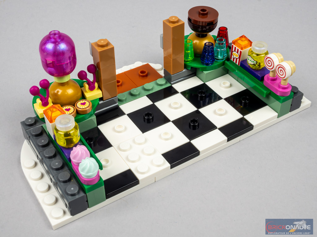 On commence par assembler une base blanche, couverte à l’intérieur de Plates 2×2 w/ 1 knob blanches et noires formant un damier. Des étals verts, et une première rangée de briques entourent le tout. On ajoute dans les deux vitrines semi-circulaires et sur les étals toute une collection de confiseries.