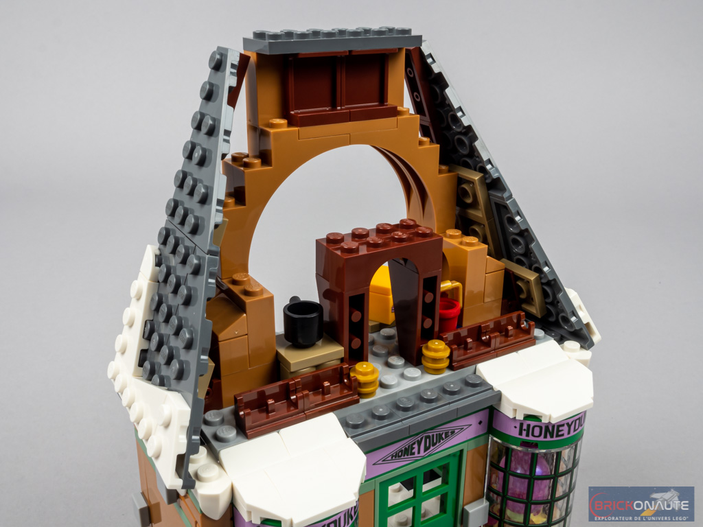 Ça, c’est dit. Car pour le reste, c’est franchement pas mal. À commencer par le design extérieur des deux bâtiments. Les formes et les couleurs sont cohérentes avec leurs alter-egos cinématographiques, même si un sand green aurait peut-être été plus adapté pour la confiserie. Le côté asymétrique de la taverne est bien reproduit, et l’échelle entre les différents niveaux des bâtiments est cohérente – tout comme l’angle retenu pour les toitures. La neige est joliment représentées sur celles-ci, plaçant comme il se doit notre (portion de) village en saison hivernale.