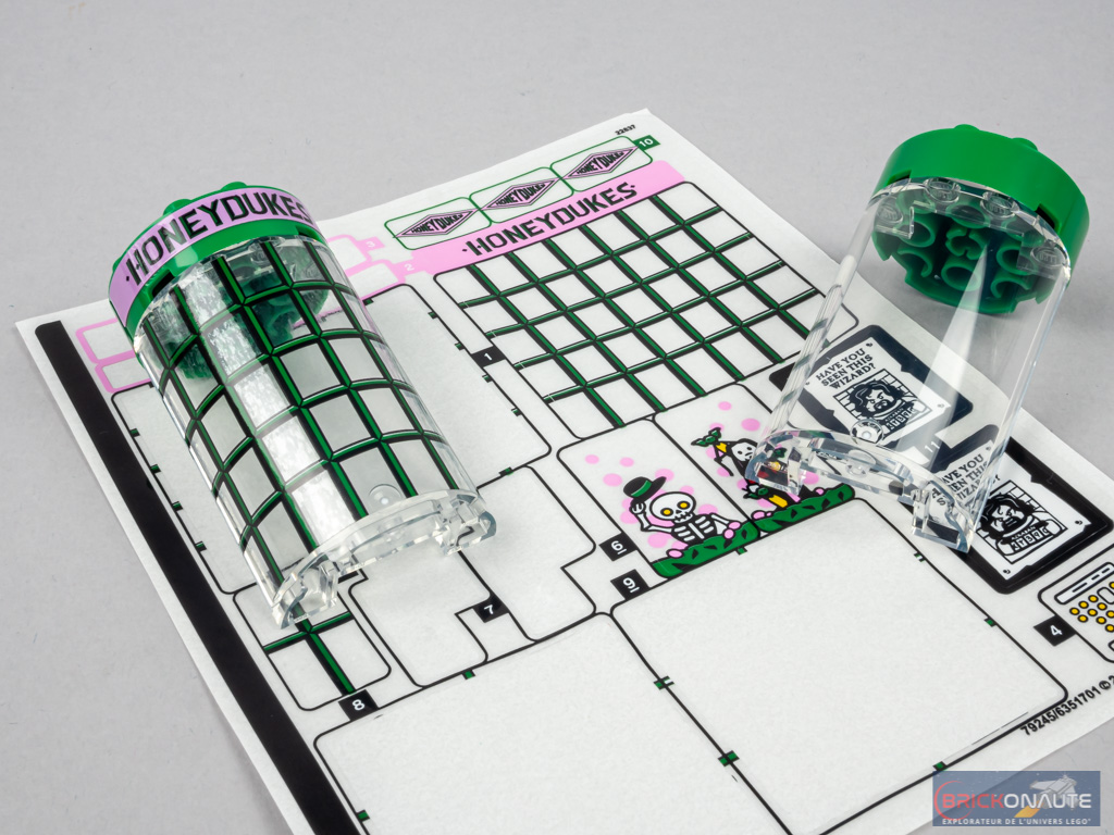 Un deuxième sachet qui commence difficilement : il est nécessaire d’appliquer de grands autocollants transparents, sur des demi-cylindres eux-mêmes transparents. Pour une boîte portant la mention « 8+ », c’est un peu compliqué… Juste au-dessus, des briques rondes vertes portent également l’inscription Honeydukes, on veillera à bien aligner les autocollants.