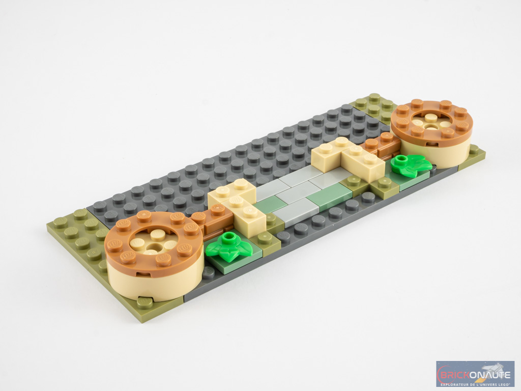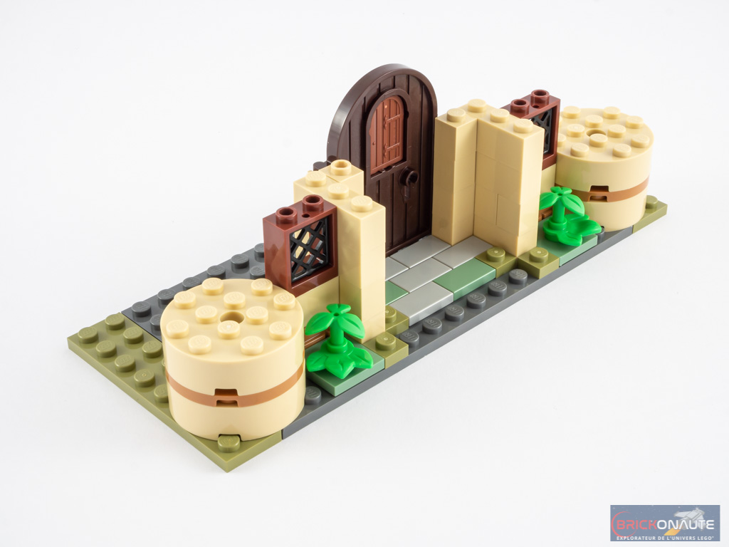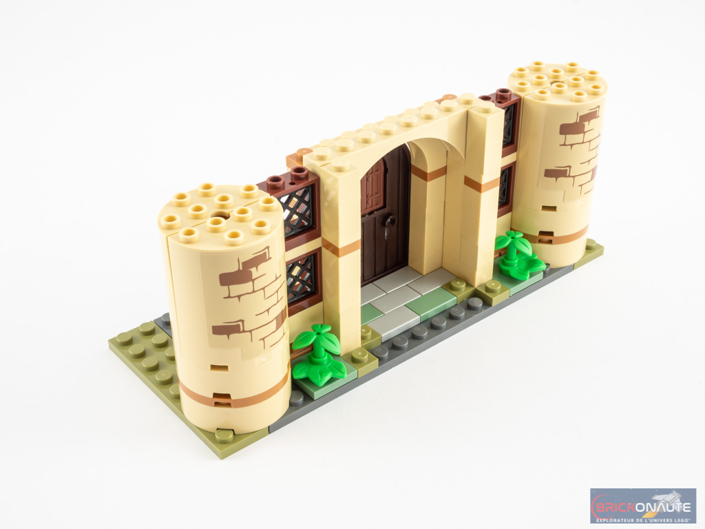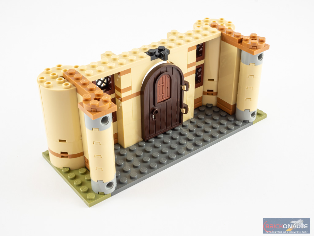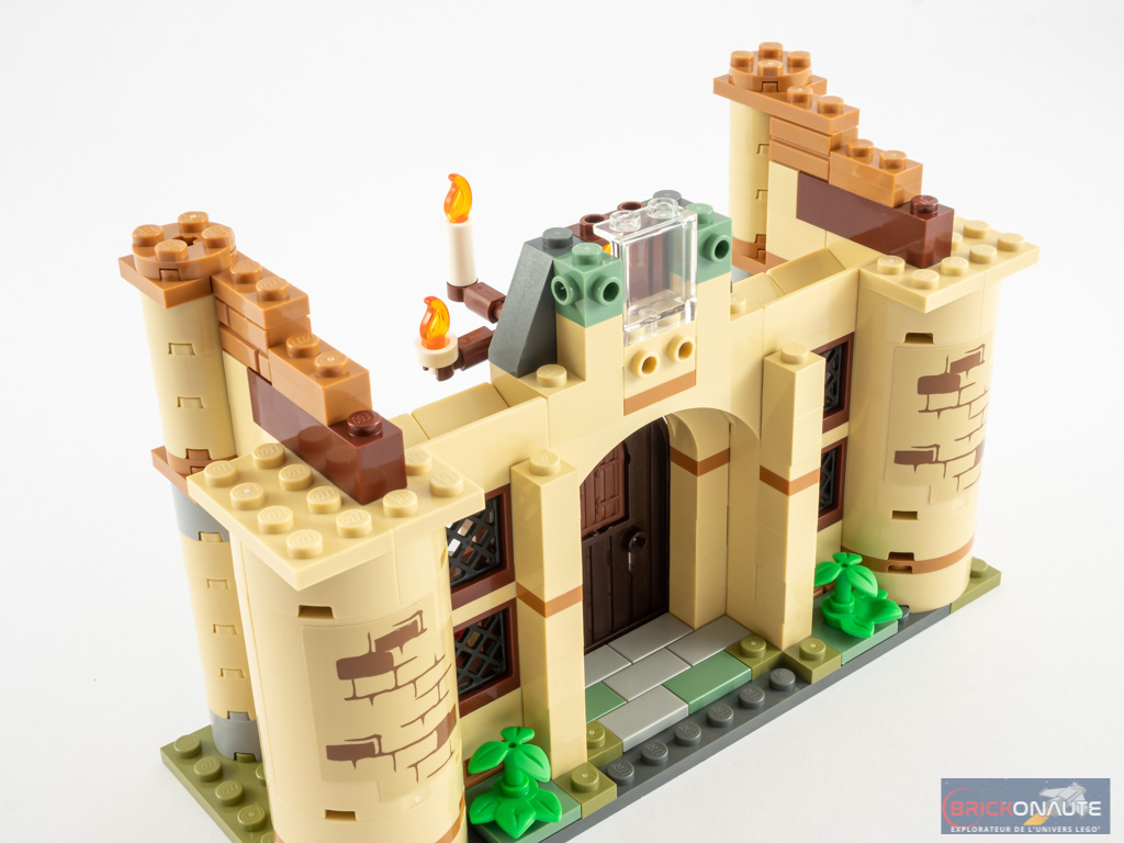 Sur une grande base grise et verte, on commence par ajouter la base des deux tours, une première rangée de murs et quelques pavés. On élève les murs, dans lesquels sont insérés de petites lucarnes grillagées. Une lourde porte en bois ferme le bâtiment. Côté extérieur, deux arches de couleur tan sont disposées au-dessus de la porte. Les colonnes sont constituées de demi-cylindres sur lesquels on vient appliquer deux grands autocollants, pas spécialement faciles à coller.