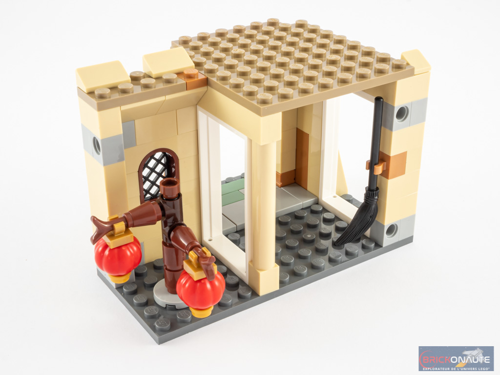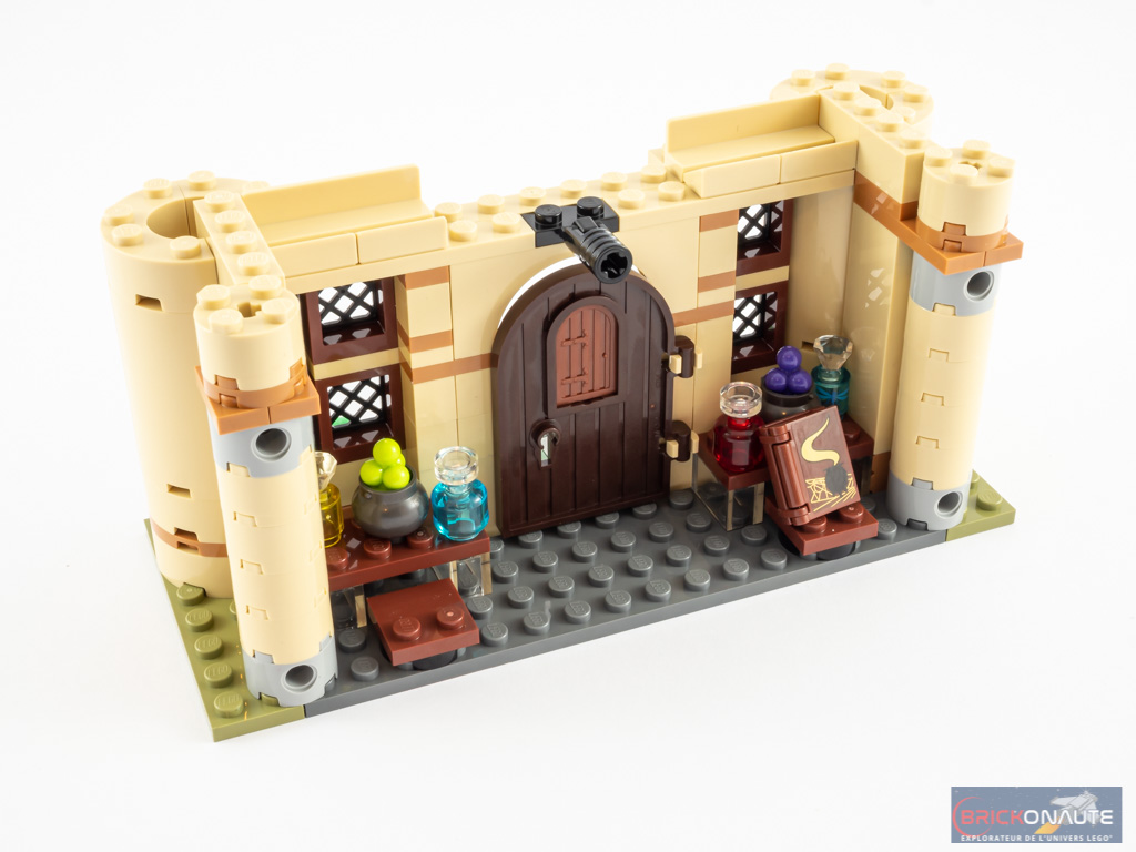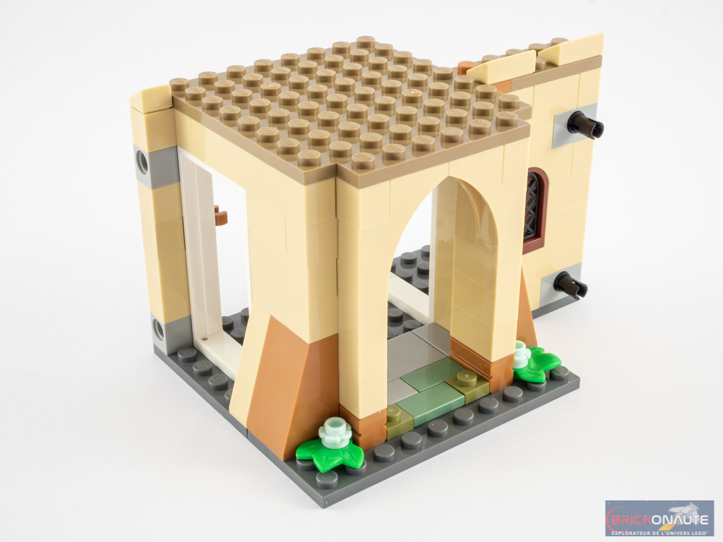 Nous commençons la construction de notre set par la serre utilisée pour les cours de botanique. On regrettera à ce titre de ne pas trouver de minifig du professeur Chourave dans la boîte. Sur une base verte, on ajoute le mur du fond composé d’une rangée de briques et d’une grande surface vitrée. Nous construisons alors les deux portes, puis nous ajoutons 4 pots contenant des Mandragores (une round brick tampographiée surmontée d’une touffe de feuilles). On assemble alors la façade opposée, constituée d’une grande arche qui permettra d’accéder aisément à l’intérieur. Quelques feuilles décorent l’extérieur de la serre. Nous terminons celle-ci avec un sous-assemblage pour le toit vitré, qui vient se caler entre 4 rangées de panels. Cette première construction est d’ores et déjà très intéressante, et le résultat est convaincant.