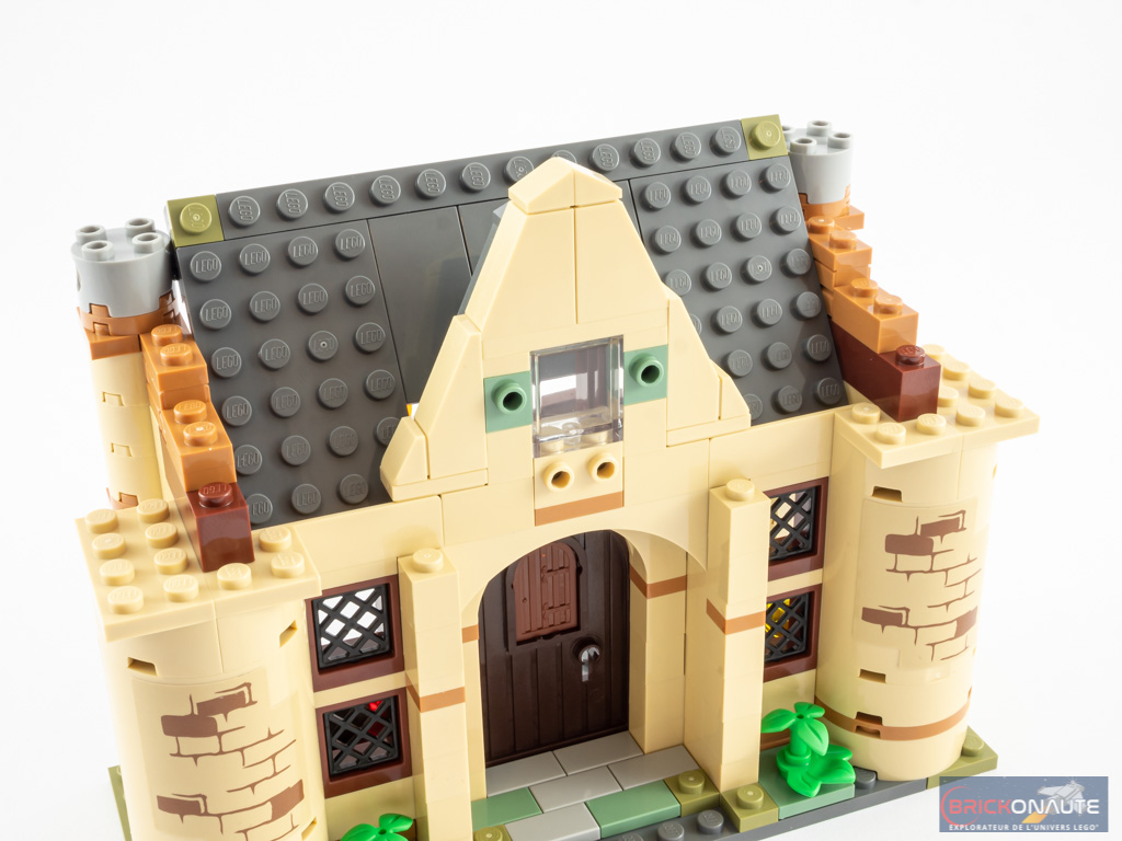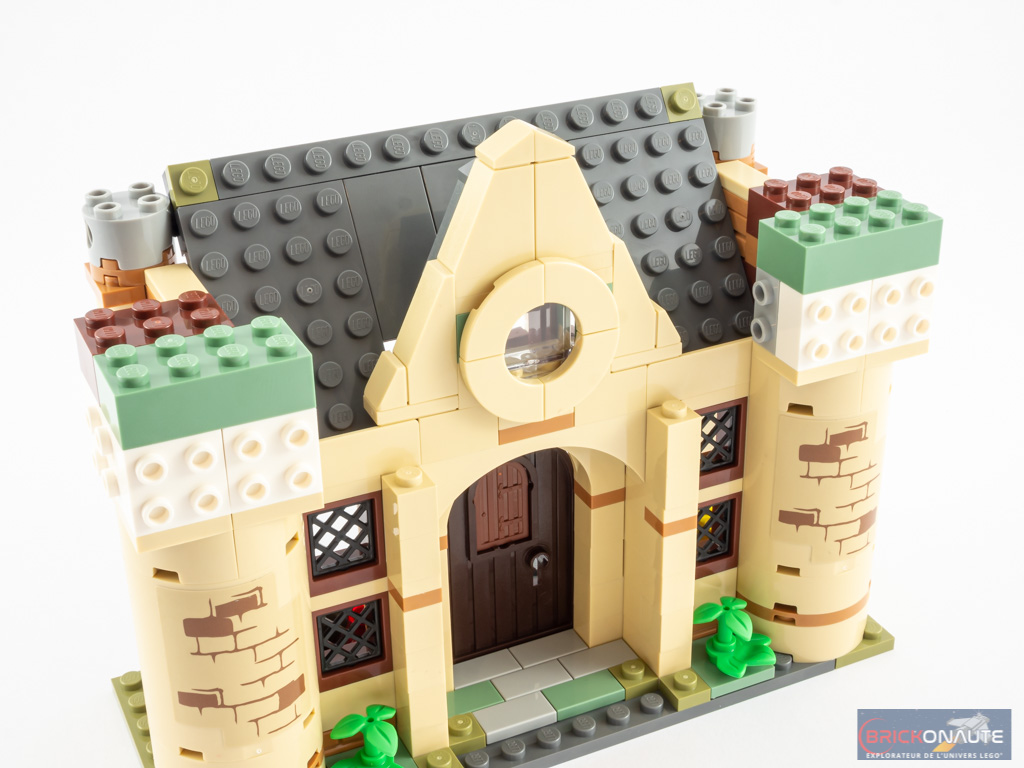 Les amateurs de BrickHeadz ne seront pas dépaysés par la conception intérieure des grosses tours : 4 briques SNOT reçoivent un habillage de slopes afin d’obtenir leur forme (presque) ronde. La construction s’achève avec les toits des 4 tours, surmontées comme à l’accoutumée dans cette gamme LEGO Harry Potter de bâtons de ski couleur sand green.