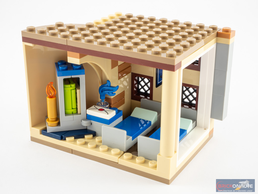 La partie supérieure de la tour est assemblée à part. Nous commençons par le dortoir des Serdaigle dont la base comporte une pièce arrondie constituant la tour qui se prolongera aux niveaux supérieurs. Les murs sont constitués d’un assemblage de briques et de quelques lucarnes, comme les niveaux du dessous. Des briques SNOT recevront l’une des petites tour à l’étage du dessus. Côté intérieur, on trouve deux lits, un bureau avec une lettre, un encrier et sa plume, et une bibliothèque avec un livre et un journal. Une demi-voute sépare la partie tour de la partie dortoir.