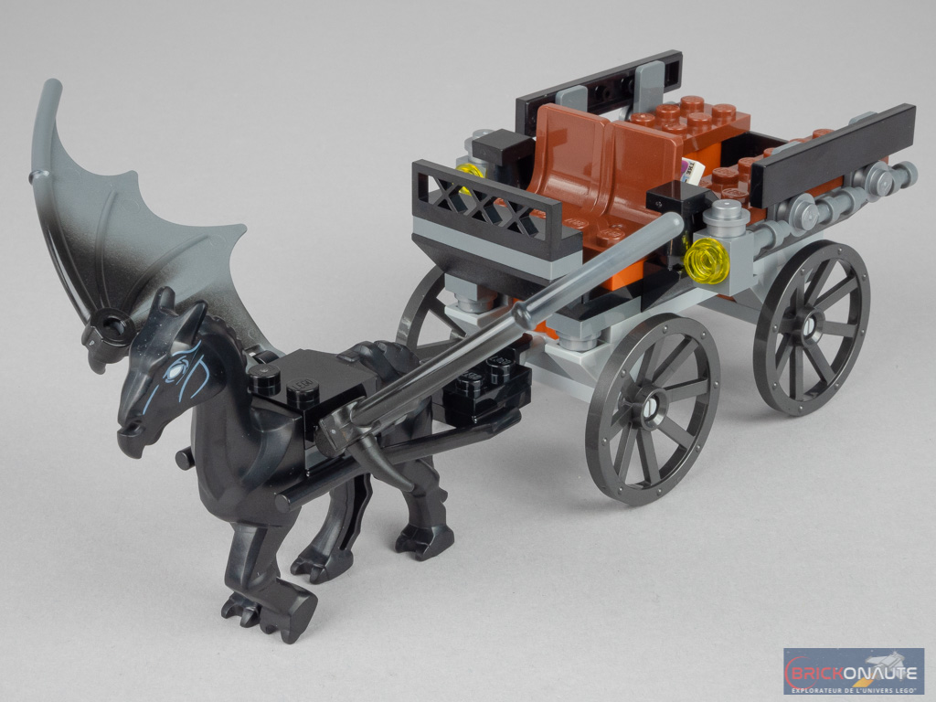 Les deux Sombrals sont franchement superbes, même si je regrette le choix des pièces grises pour combler le corps de l’adulte, à la base de ses ailes. Le chariot l’est tout autant, malgré son apparente simplicité il parvient à capturer de façon convaincante les formes et proportions du véhicule. Seul petit regret : les roues arrières devraient être légèrement plus grandes qu’à l’avant. L’arbre est à mon goût plus dispensable avec ses couleurs trop vives, mais il aura le mérite d’ajouter un peu de « contexte ».