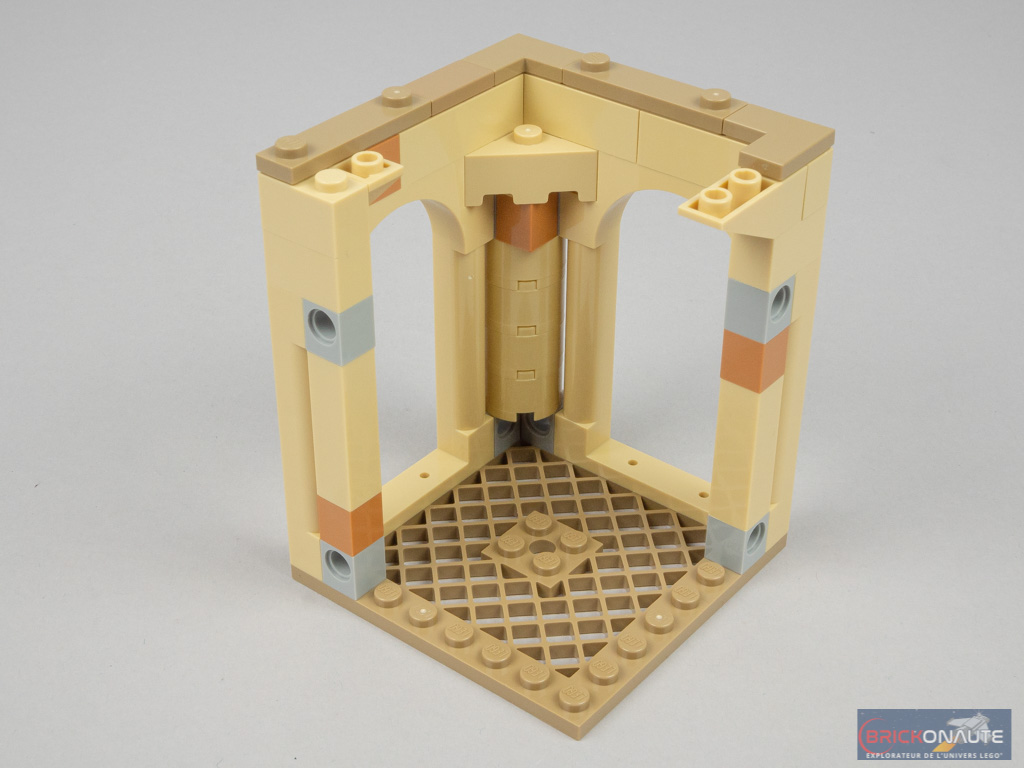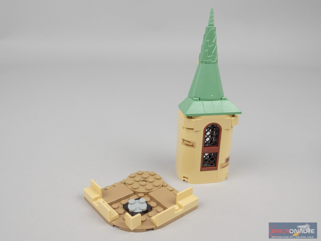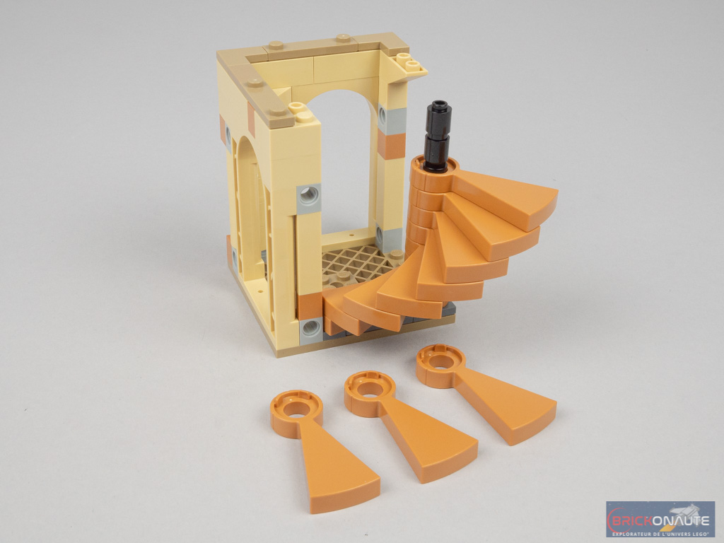 On continue en construisant les deux morceaux de toit pour la cour, puis on s’attaque au module suivant constituant le rez-de-chaussée de la tour. Sa conception est très simple : deux arches et quelques briques Technic, et un escalier en colimaçon dont les 11 éléments tournent autour d’une pile de briques rondes (un système similaire était présent dans la référence 75954 Hogwarts Great Hall sortie en 2018). On « ferme » la partie supérieure avec quelques tiles, puis on passe au niveau supérieur.
