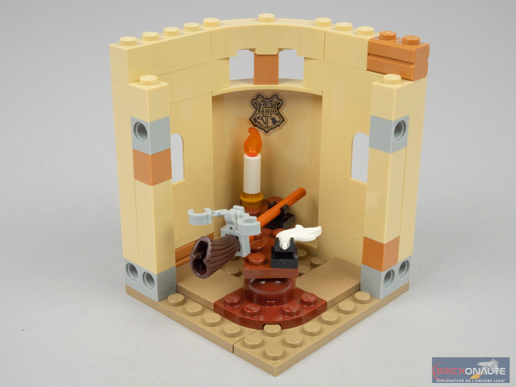 Pour l’étage supérieur, LEGO nous propose une petite variation de forme : si l’angle intérieur mesure bien 8×8 tenons, l’extérieur est arrondi. Ce qui n’empêche pas ce module d’être compatible avec les autres. C’est le seul intérieur vraiment aménagé de l’ensemble : on y retrouve un bureau avec une plume, une chandelle et le balai d’Harry. Ce module n’utilise pas les arches habituelles mais nous propose de les construire, une colonne soutenant la partie intérieure.