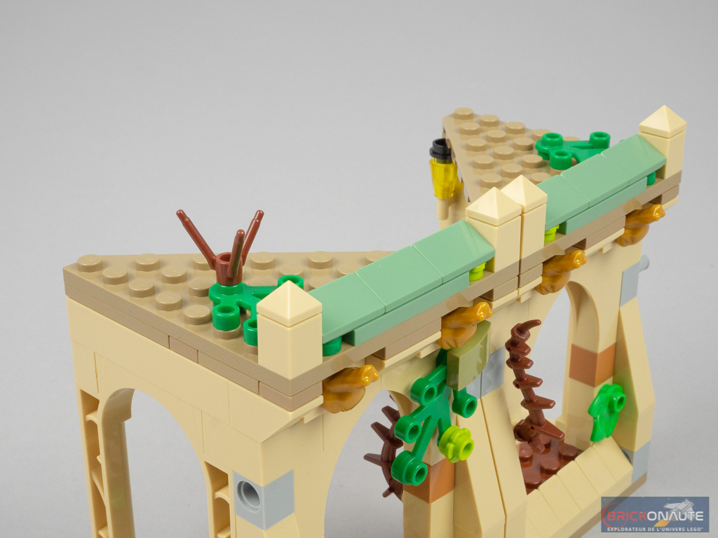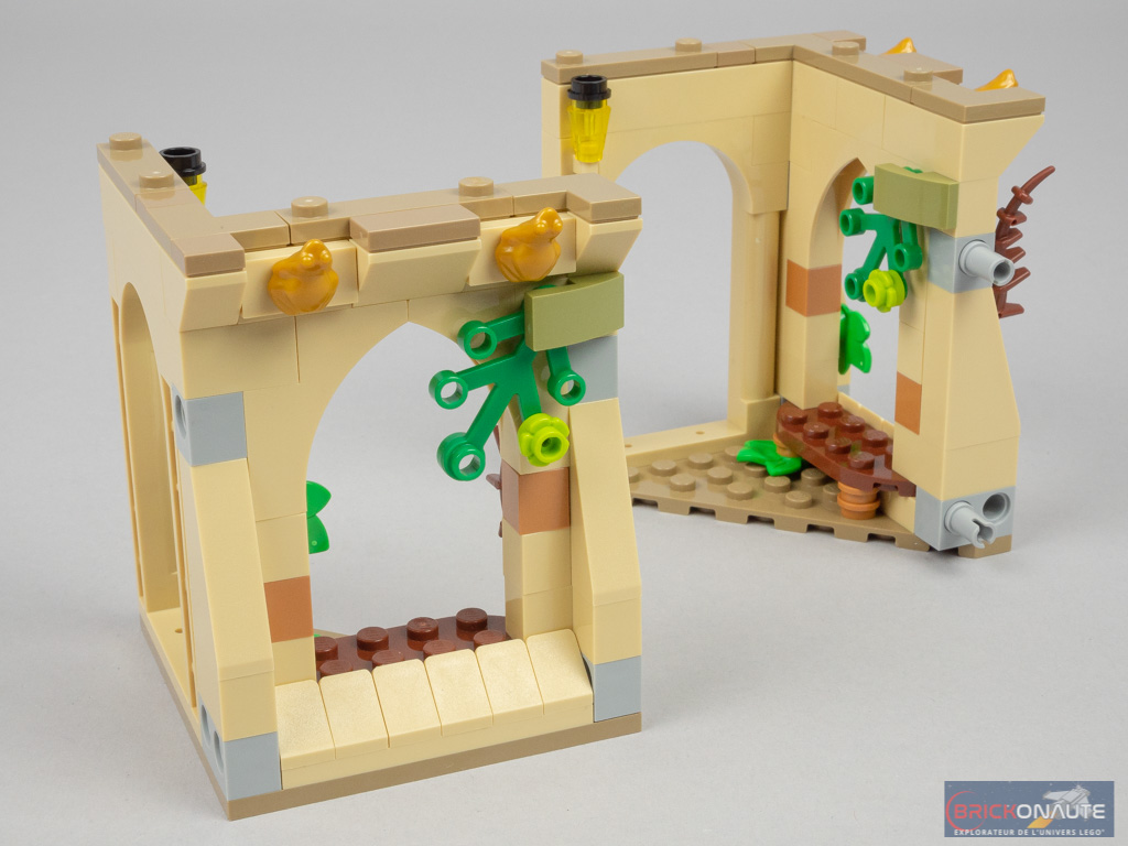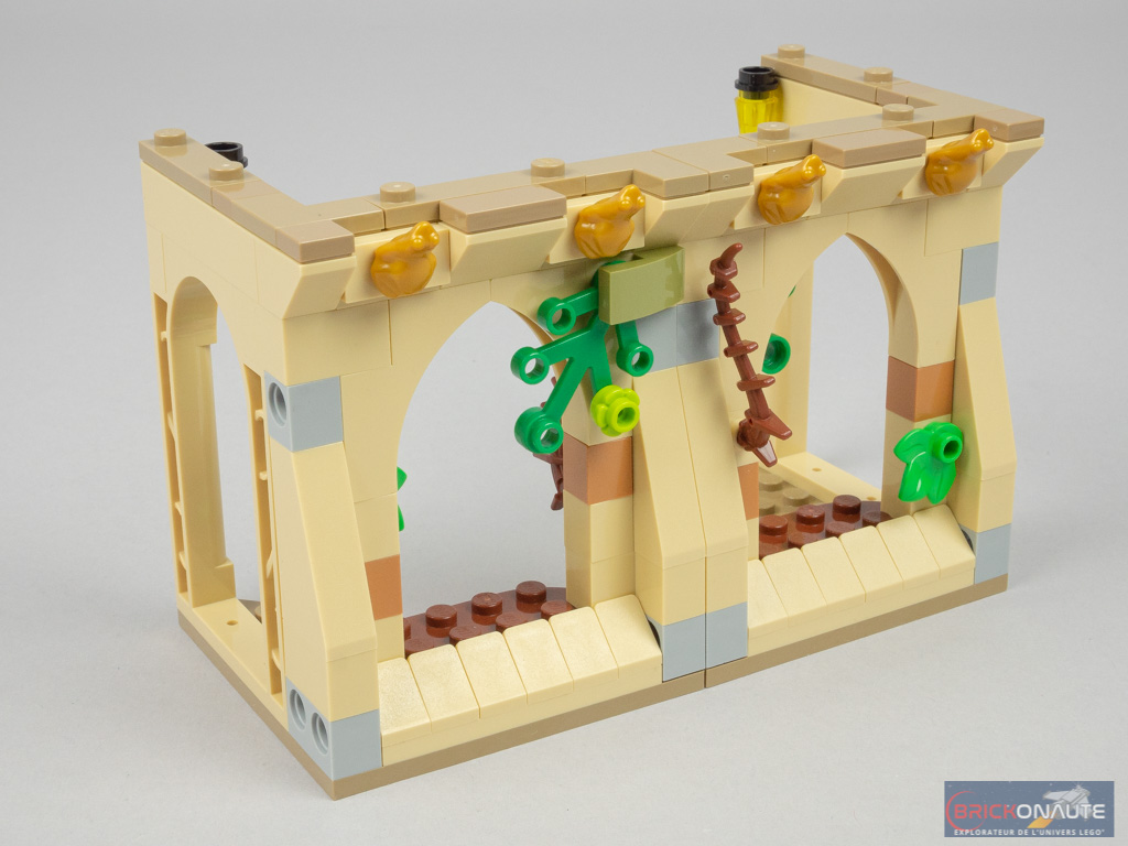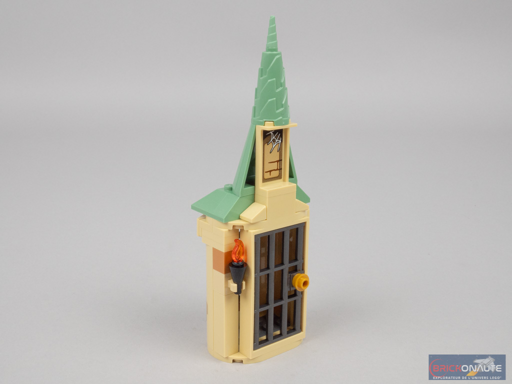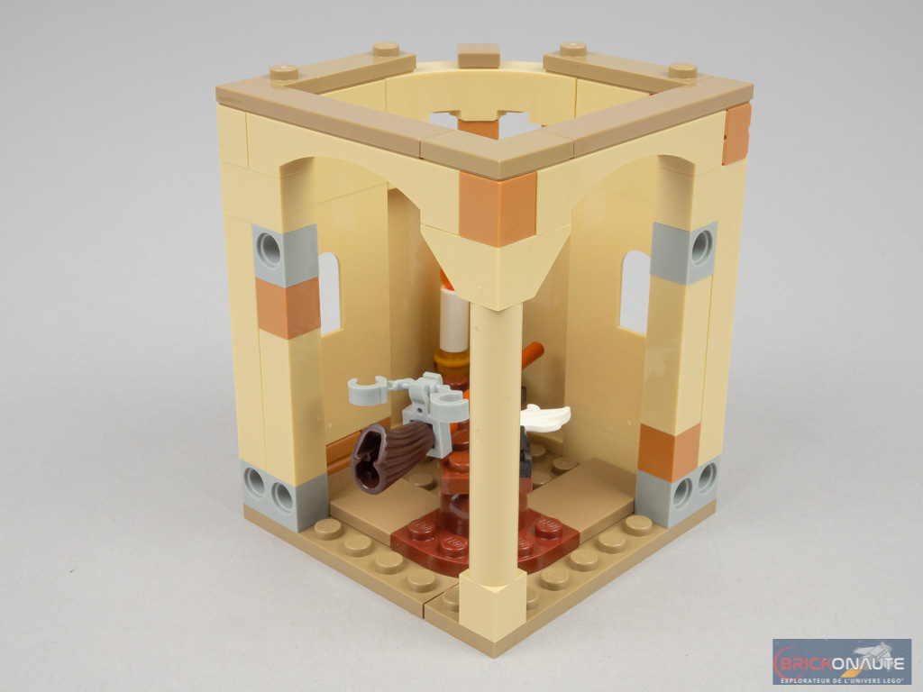 Le design n’est pas non plus le meilleur que j’aie pu voir dans les différentes sections de château que j’ai pu construire. Dans la configuration d’exposition permettant de déployer l’escalier, on peut voir l’arrière d’une arche destinée à être reliée à d’autres modules. Et c’est assez moche. Le reste est plutôt sympa, qu’il s’agisse de la section de cour avec sa végétation ou ses plantes, de l’étage à la forme arrondie abritant un petit bureau, ou de la cellule de Sirius qui trouve un angle intéressant permettant de rompre la monotonie.