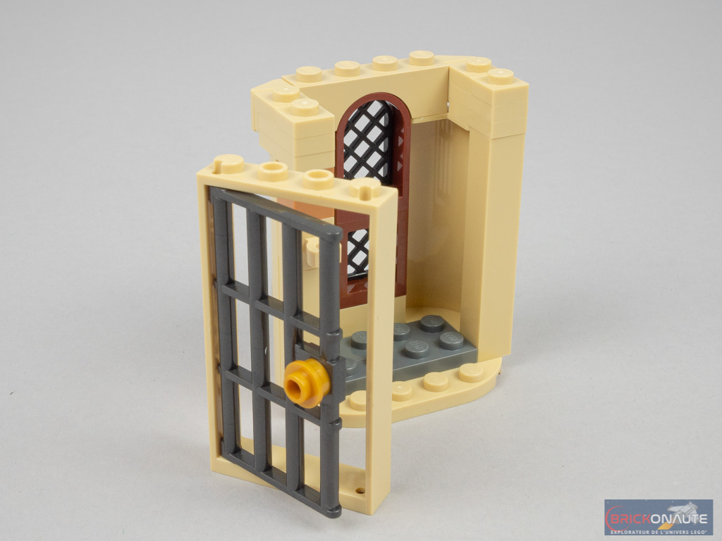 Nous passons alors à la cellule de Sirius Black, de forme arrondie et mesurant 2×6 tenons. On trouve une grande fenêtre grillagée côté extérieur, et une porte de prison de l’autre côté. Elle est surmontée d’une toiture conique couleur sand green.