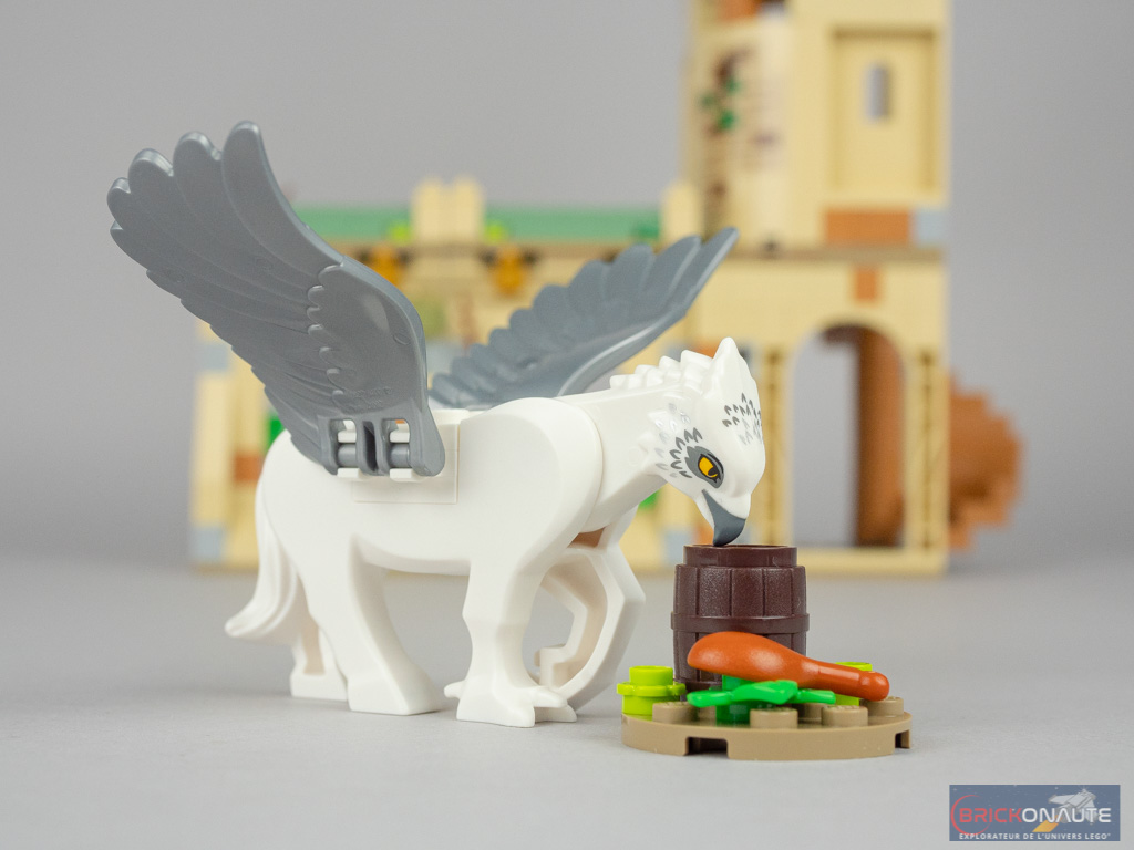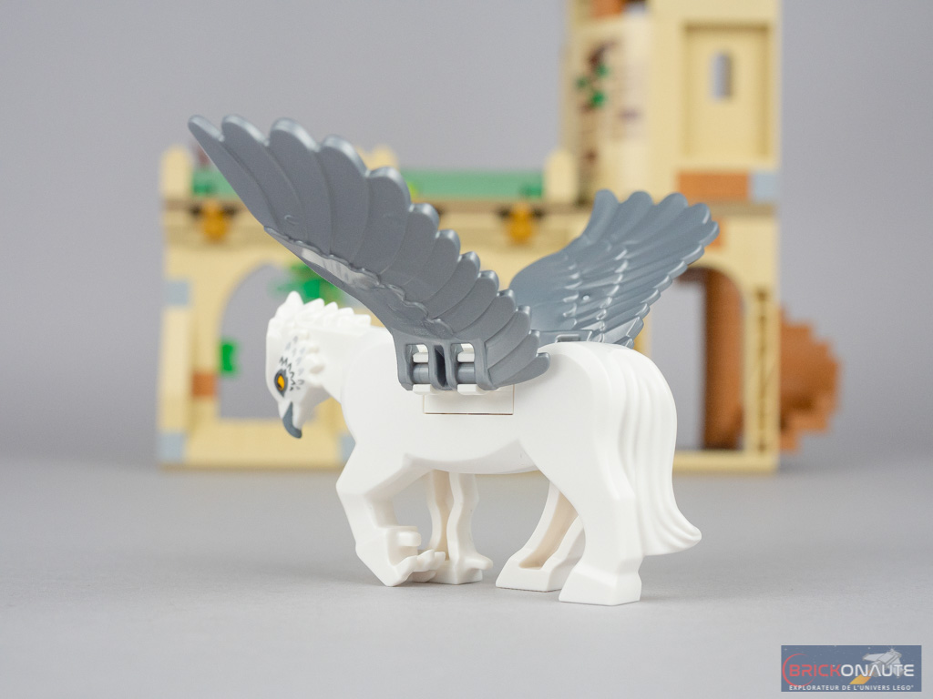 Dernier « personnage » présent, même s’il ne s’agit pas d’une minifig, l’hippogriffe Buck (ou Buckbeak en VO). Il s’agit d’un nouveau moule, et les proportions du corps sont celles d’un cheval si ce n’est que la réservation sur son dos mesure 2×2 tenons. À l’arrière, ce sont des pattes et une queue de cheval. Et côté avant, c’est donc une tête et des pattes d’aigle. LEGO a fait le choix de nous proposer des ailes argentées, pourquoi pas. Je suis moins convaincu par le blanc immaculé du corps – seule la tête est tampographiée. Dans le film, son plastron est très clair, mais l’arrière du corps, les pattes et la tête sont plutôt gris.
