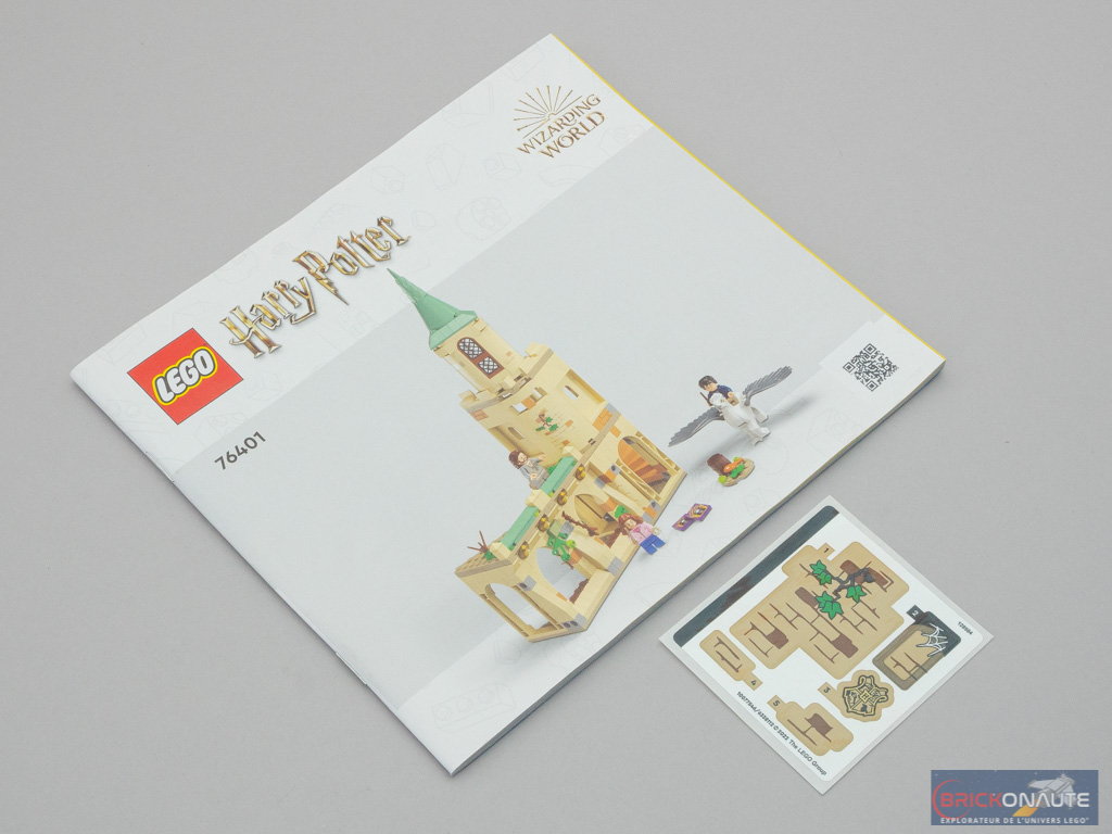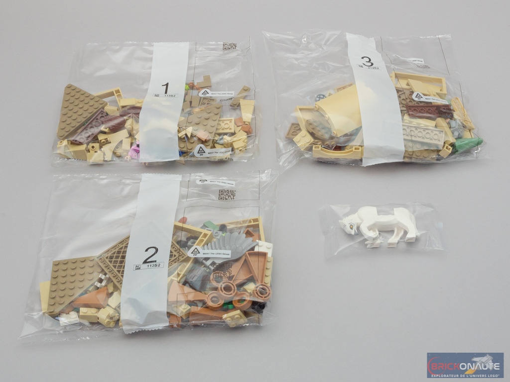 À l’intérieur, nous trouvons 3 sachets numérotés et un quatrième contenant l’hippogriffe Buck. La notice compte 84 pages pour 121 étapes de construction, et il y aura un total de 5 stickers à coller. Une lecture rapide de l’inventaire ne m’a pas permis de détecter d’éléments particulièrement rares, hormis les pièces composant l’animal.