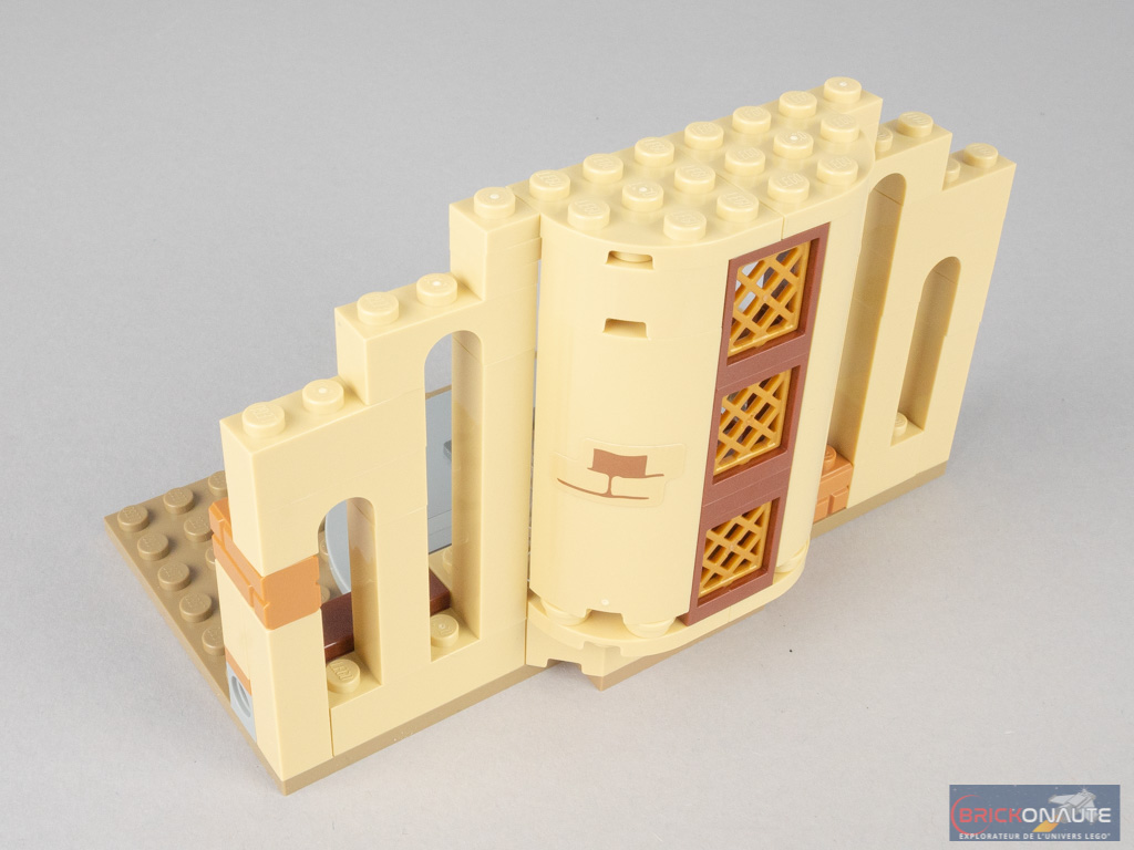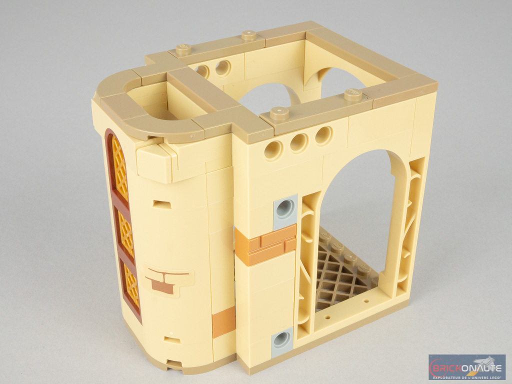 La construction commence par l’étage intermédiaire, qui se base sur une plate de 8×16 tenons. On élève les murs percés de fenêtres de différentes tailles. Au centre, on retrouve une légère avancée en forme de demi-cercle, qui vient abriter le fauteuil de Dumbledore. Une petite estrade permet d’y accéder.