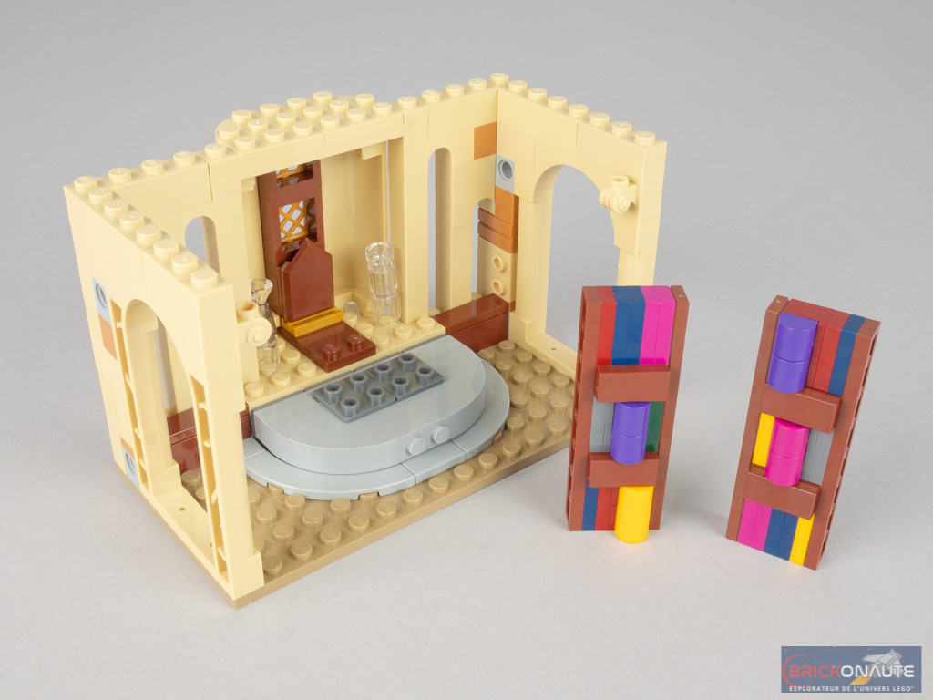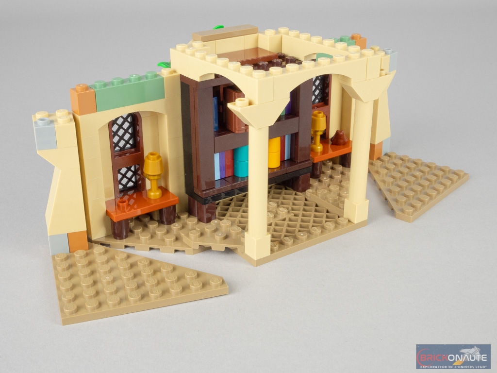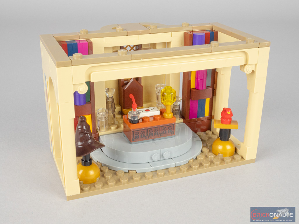 On « ferme » alors les deux côtés avec deux grandes arches, puis on continue d’élever les murs. On assemble alors deux bibliothèques dont la conception est plutôt bien pensée. Elles viennent se fixer sur des briques SNOT laissées en attente. On aménage alors le bureau avec divers éléments : un bureau et ses accessoires, et deux présentoirs : le premier pour Fumseck (Fawkes) – dans une version minimaliste – et le second pour le Choixpeau. On termine cette étape avec une rangée de tiles en partie haute à la manière des bâtiments modulaires, et deux éléments de toiture.