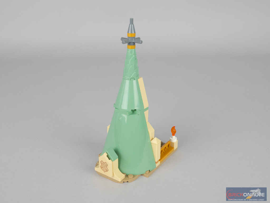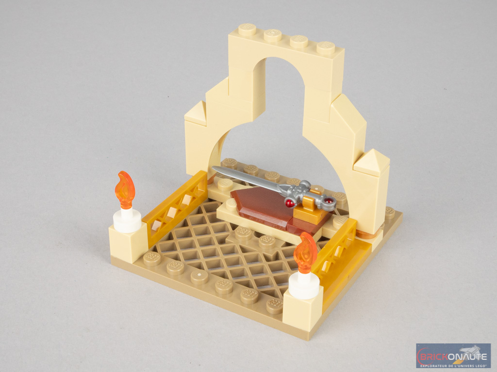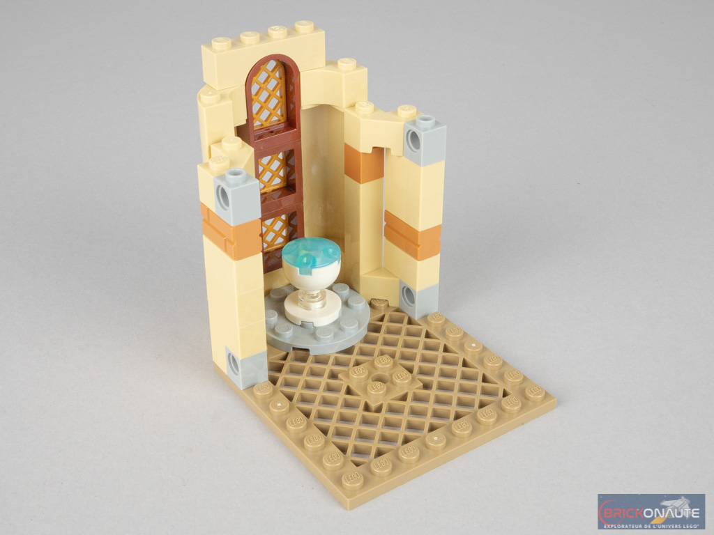 On s’attaque ensuite à la partie supérieure, qui reprend la même forme arrondie que le bureau. On y retrouve également une grande fenêtre centrale marron et or. On installe la pensine au centre, puis on referme les côtés là encore avec deux arches. La partie supérieure reçoit également des tiles qui supporteront la toiture. Toiture qu’on construit ensuite sur une base de 8×8 tenons. La très belle épée de Godric Gryffondor se cache sous le grand toit conique. Deux petites tourelles sont attachées sur le côté et sont facilement détachables pour préserver, si besoin était, la modularité de l’ensemble.