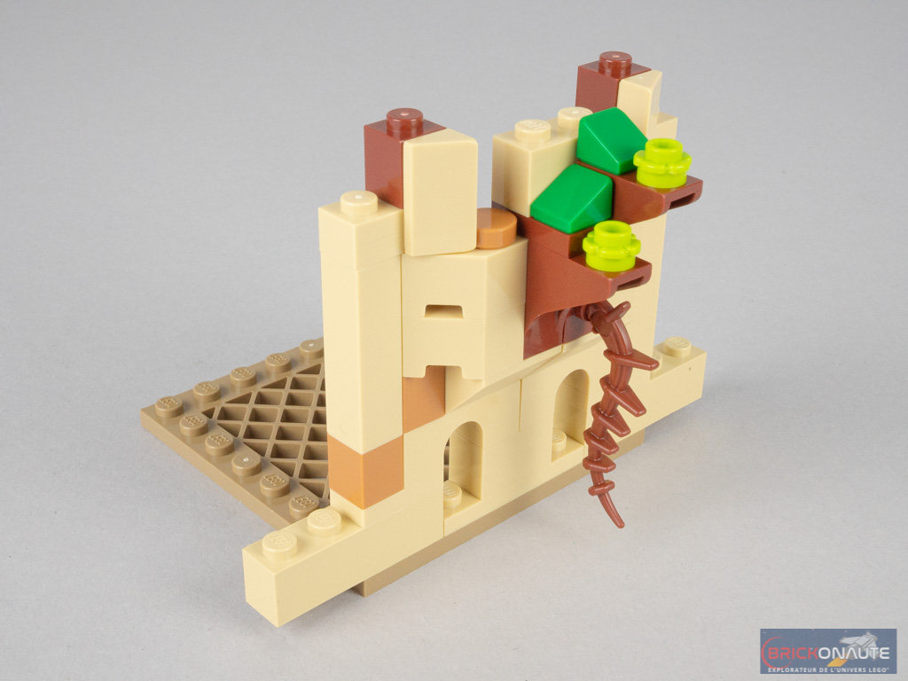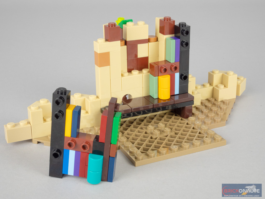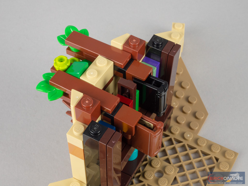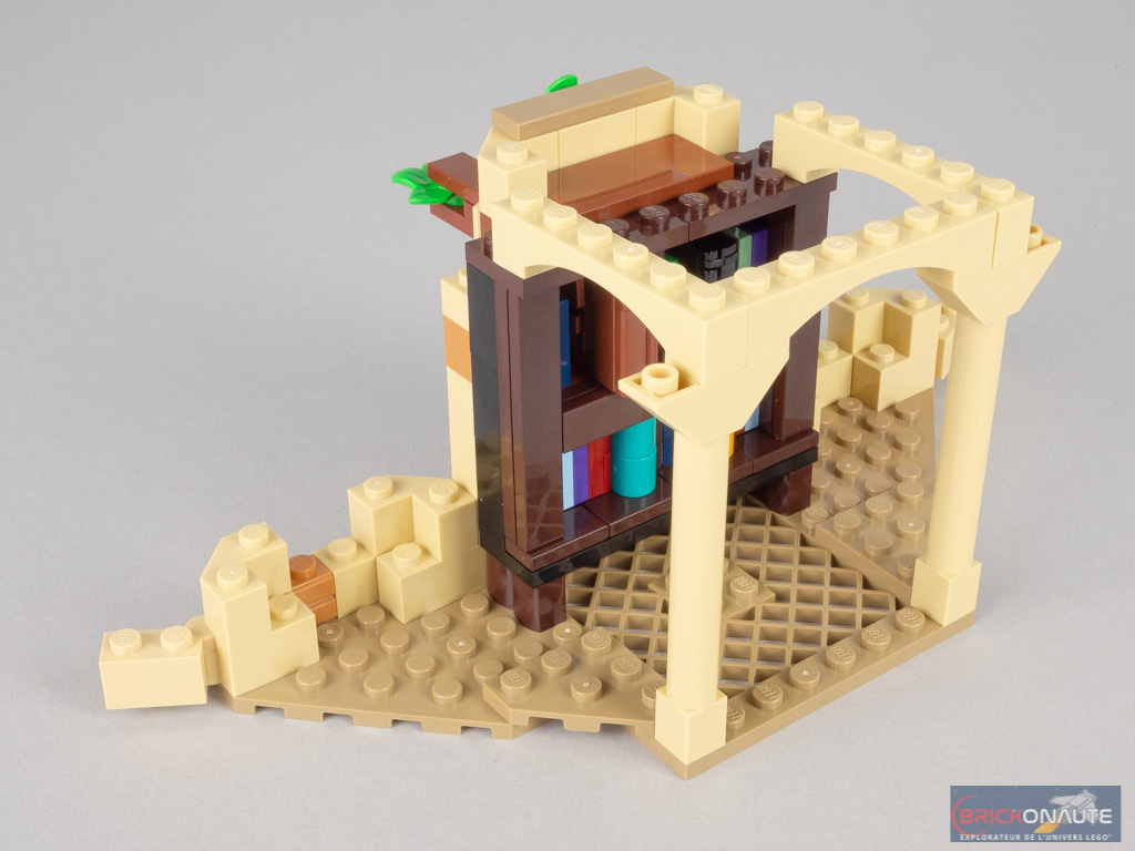 Vous l’aurez compris, on terminera notre construction par le niveau bas. Sa partie centrale est basée sur un élément de 8×8 tenons, élargi de part et d’autre par deux éléments triangulaires. Côté extérieur, la végétation a repris ses droits. Côté intérieur, on trouve une grande bibliothèque assemblée sur le même principe que précédemment. Deux livres sont reliés par un petit mécanisme à l’extérieur : pousser sur les feuilles les fait sortir de la bibliothèque.