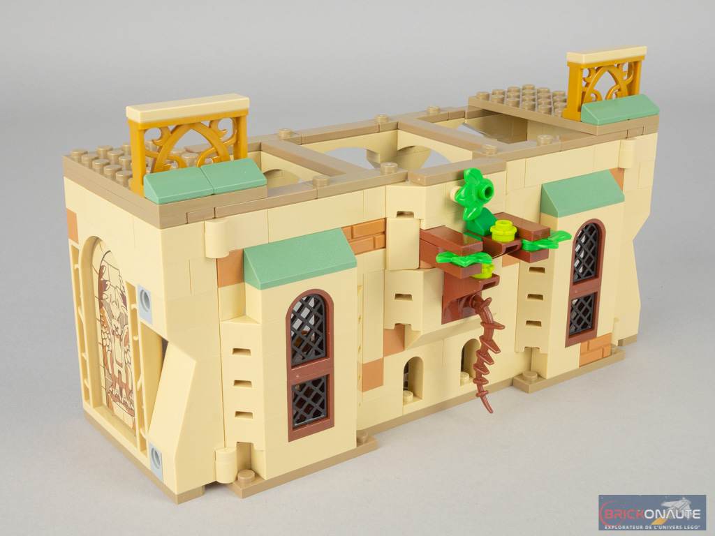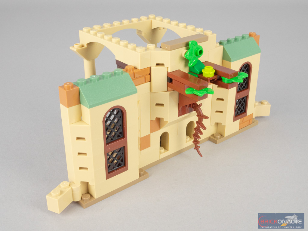 La conception modulaire de cette collection de sets est une vraie bonne idée. Vous aurez certainement remarqué sur les photos que les arches latérales sont rigoureusement identiques d’un niveau à l’autre. Et elles sont accompagnées de petites briques trouées pour sécuriser la connexion entre les différents éléments. Tous les modules qui composent le château sont également « géométriquement compatibles » : même hauteur, et largeur toujours multiple de 8 tenons (ici 24 en bas, 16 pour le niveau intermédiaire, et 8 en haut). Des petits bouts de toiture de 4 tenons de large facilement détachables permettent d’obtenir le décalage observé entre les niveaux et cette jolie forme triangulaire.