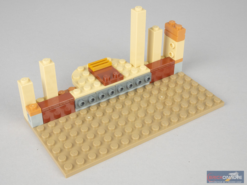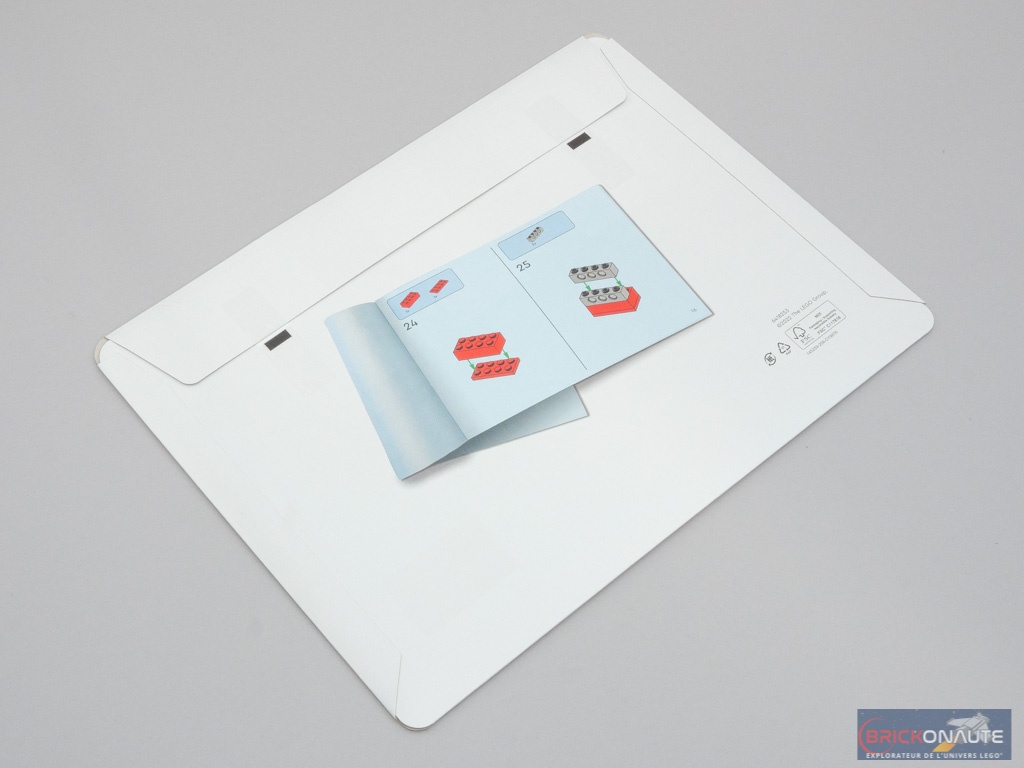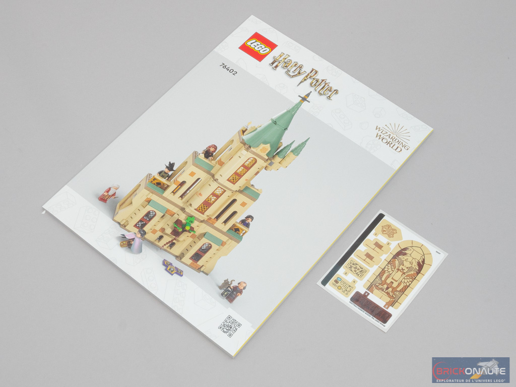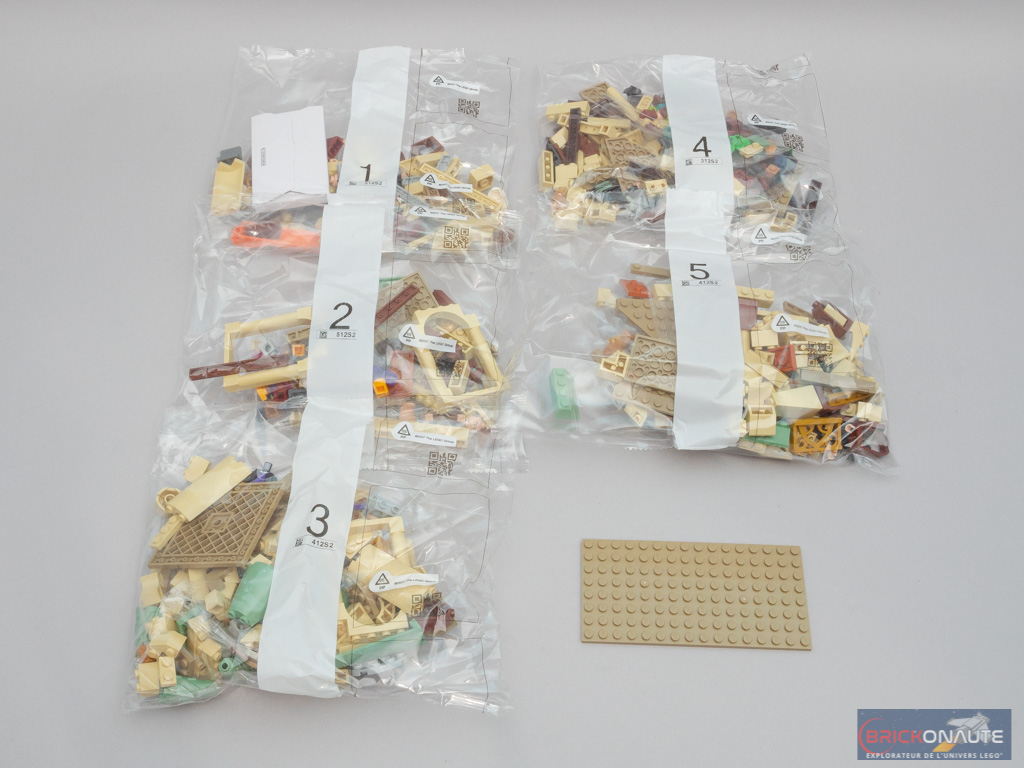 À l’intérieur de la boîte, nous trouvons 5 sachets de pièces numérotés et une plate de couleur dark tan de 8×16 tenons. La notice d’instructions et la planche de stickers sont livrées dans un étui en carton décoré et rigide, c’est appréciable : elles sont bien protégées. La notice d’instructions comprend 116 pages pour 202 étapes de construction, et il y aura un total de 7 autocollants à appliquer.