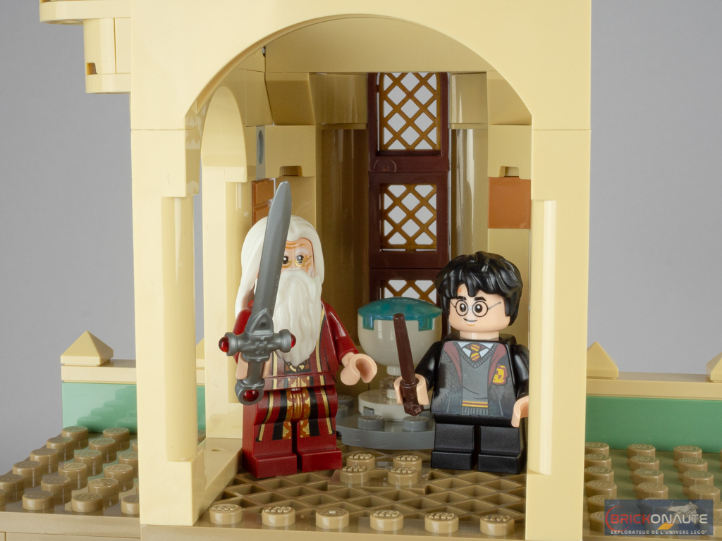Au delà de cet aspect modulaire qui est déjà un très bon point en termes de jouabilité, le set a beaucoup d’autres choses à offrir à ce sujet. À commencer par la variété des lieux proposés : la bibliothèque, le bureau de Dumbledore et la pensine. Le nombre d’accessoires fourni est également impressionnant : des livres, des bureaux, Fumseck, le Choixpeau, l’épée de Gryffondor… il y a de quoi faire.