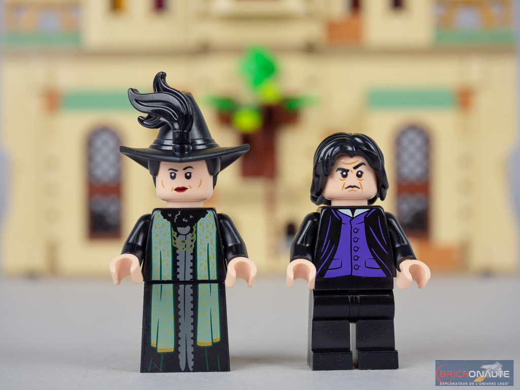 Commençons cette rubrique par un personnage jamais vu jusqu’ici chez LEGO : Irma Pince (Madam Pince), la bibliothécaire. Sa tenue est totalement inédite, de la tête aux pieds. La robe est joliment tampographiée de sand green et d’or et son visage est plutôt strict. Elle porte un joli chapeau noir dans lequel on vient fixer une petite plume. La tenue du professeur Rogue (Severus Snape) est identique à celle qu’il porte dans le set 76383 Hogwarts Moment: Potions Class, plutôt simple mais efficace et fidèle au personnage.