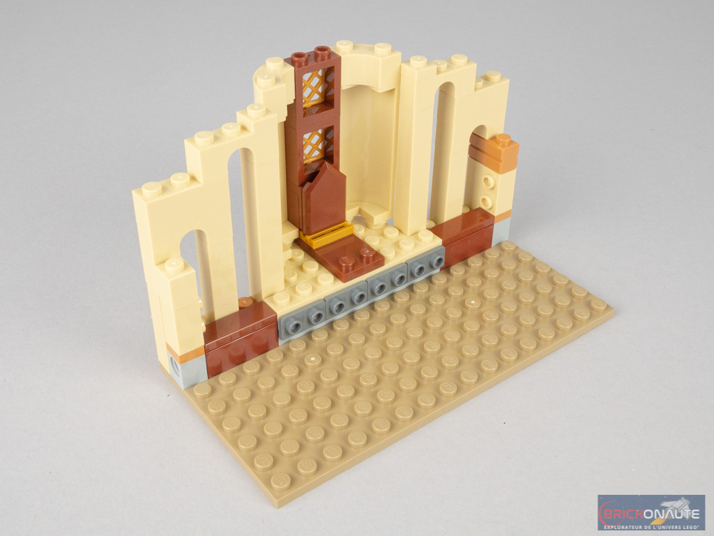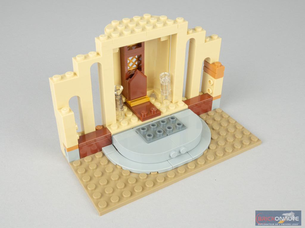 On élargit alors la façade avec notamment 2 grandes fenêtres, puis on complète le socle côté intérieur avec deux autres triangles reliés par des charnières à la structure. C’est une bonne idée qui permettra de conserver la modularité de l’ensemble, tout en autorisant une scène de jeu plus grande si on le souhaite. On y ajoute les fameuses arches, deux fauteuils et deux bureaux inclinables. On « ferme » la partie supérieure comme les précédentes avec quelques tiles, on ajoute deux morceaux de toiture, et le set est terminé.