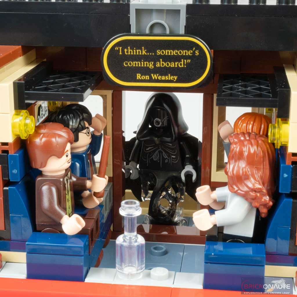 Parmi ces 20 minifigs, on trouve pas moins de 4 versions d’Harry Potter, 2 de Ron Weasley et 2 d’Hermione Granger. Les autres personnages sont « uniques ». Cette sélection nous permet de recréer quelques-unes des scènes vues dans le Poudlard Express, dans les 3 compartiments prévus à cet effet et sur le quai de gare pour l’épilogue. Mais malgré les portions « détachables » de la voiture de passagers, l’accès à certains sièges reste compliqué avec des mains d’adulte. C’est d’ailleurs probablement pourquoi LEGO nous demande d’installer tout le monde à sa place en plein milieu de la construction… Autre petit problème, il est nécessaire de lever le bras de la minifig se situant le long de la vitre côté couloir pour pouvoir l’asseoir sur son siège, trop étroit sinon. Chose impossible avec les minifigs disposant d’une chevelure imposante comme Hermione, qui a dû inverser sa place avec Ron dans la scène inspirée du premier film.